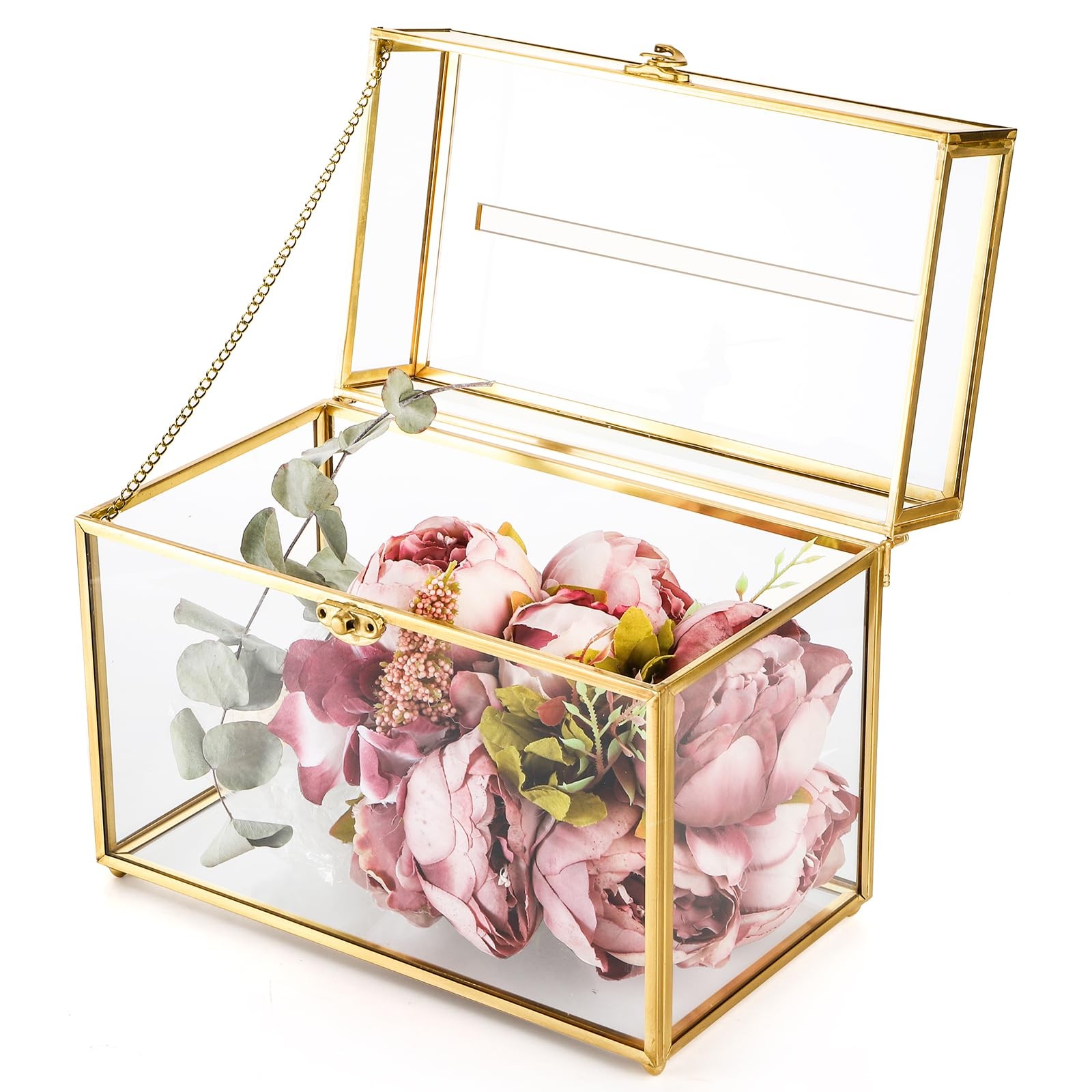 • Glass Wedding Card Box with Lock and Slot, Gold Rim Envelop Box Gift Holder, ...