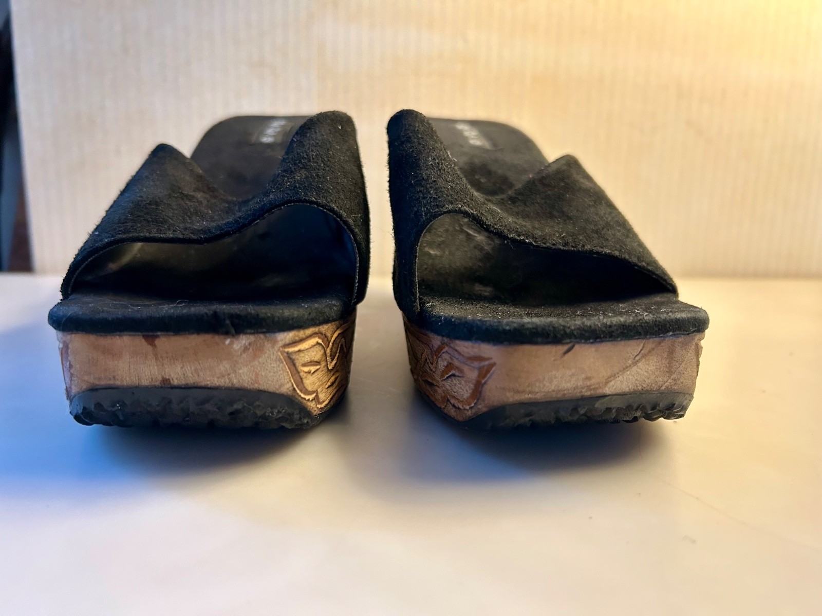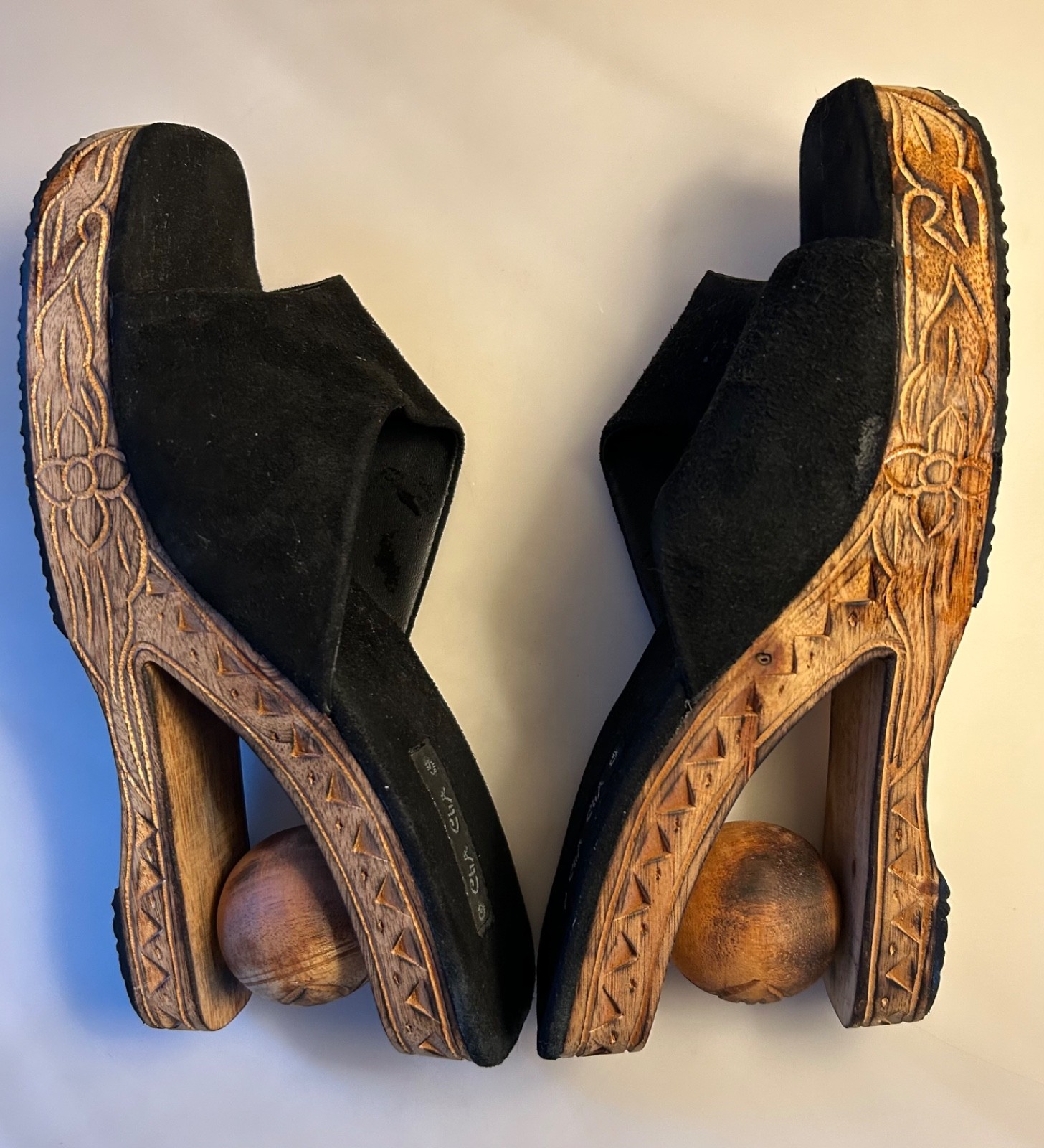 как выглядит Vtg CHA CHA Carved Wood Ball Platform Wedge Suede Shoes Sandals Sz 9 фото