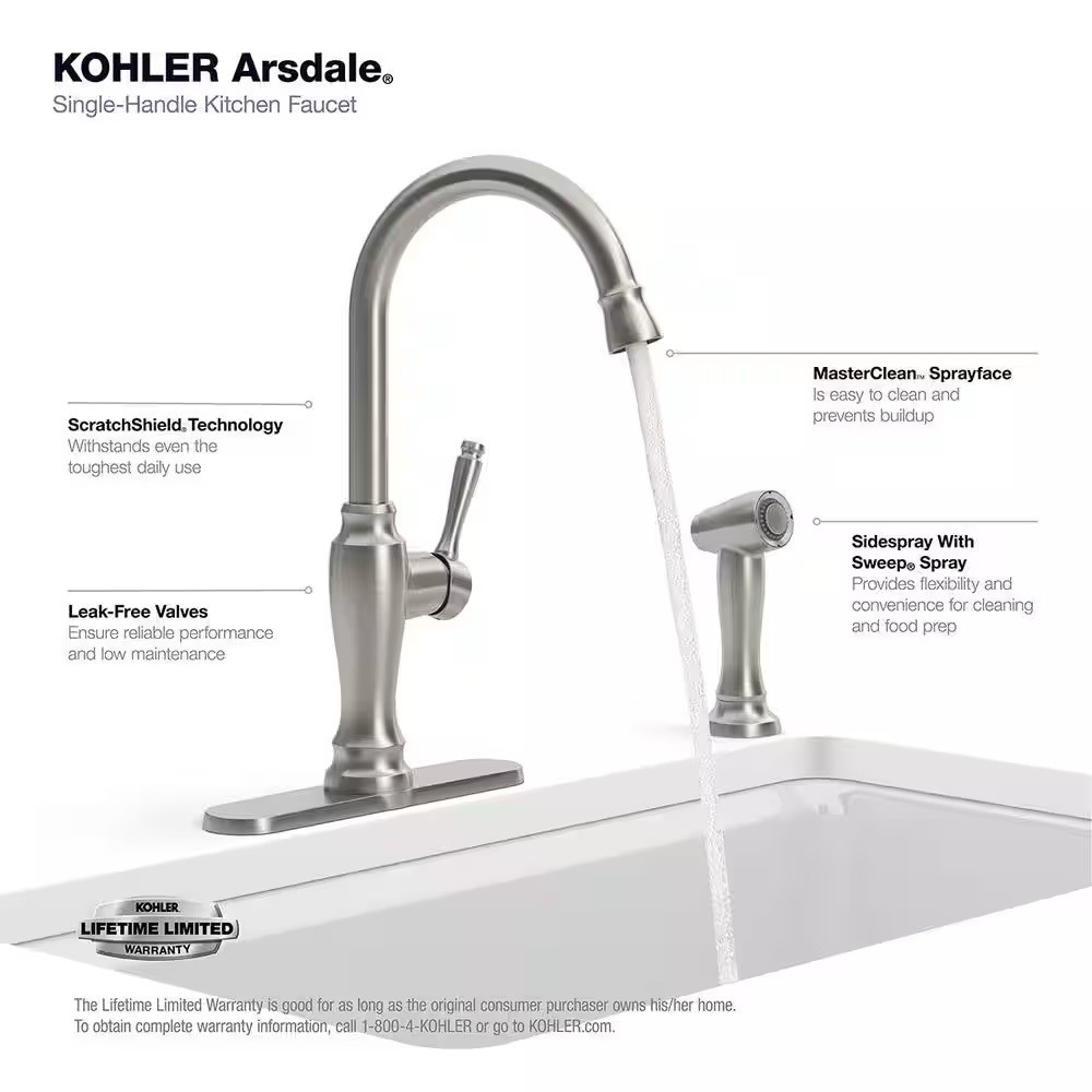Kohler Arsdale 1-Handle Standard Kitchen Faucet w/Swing Spout Sidespray R24213