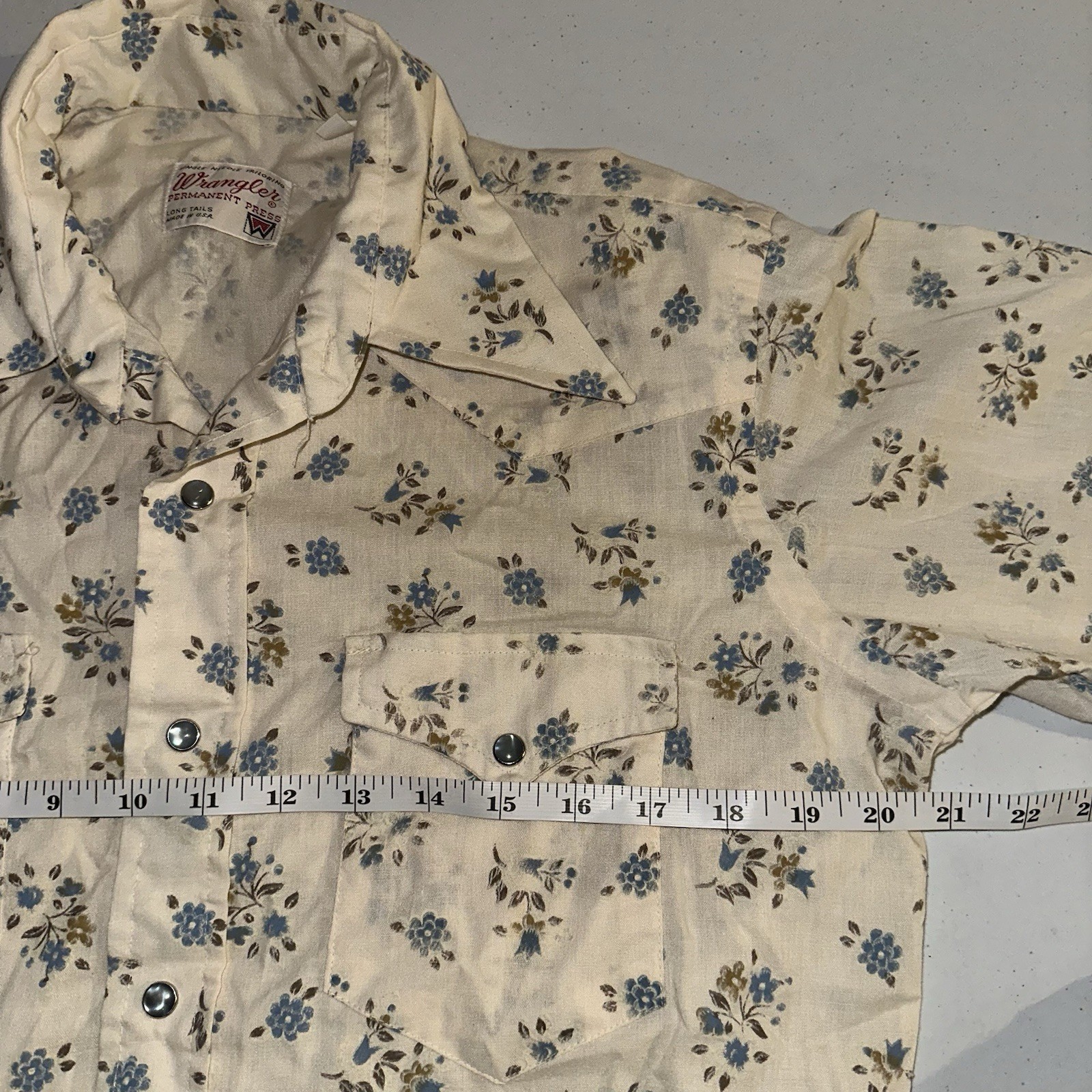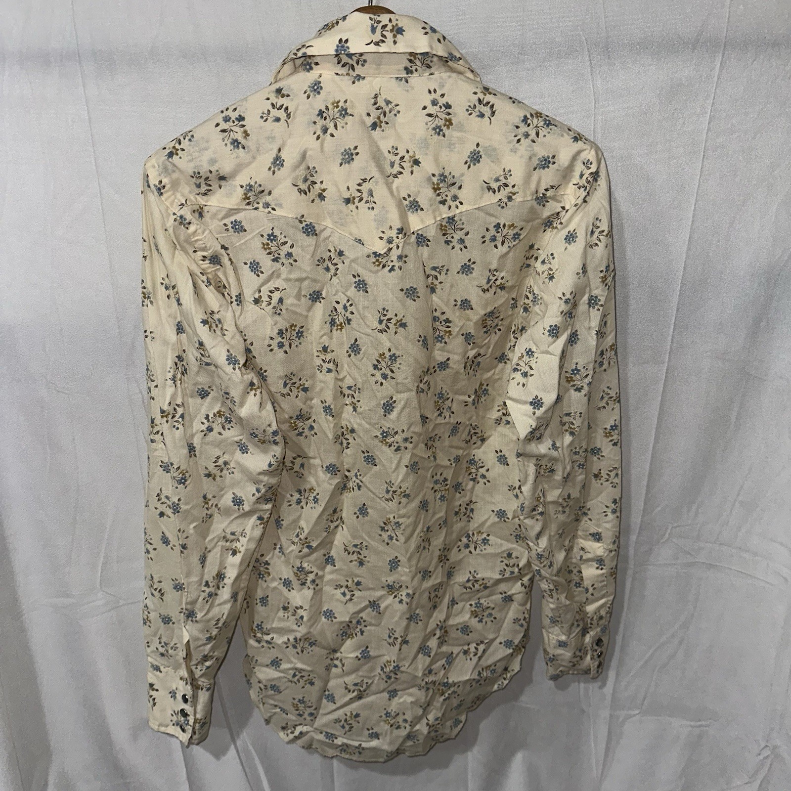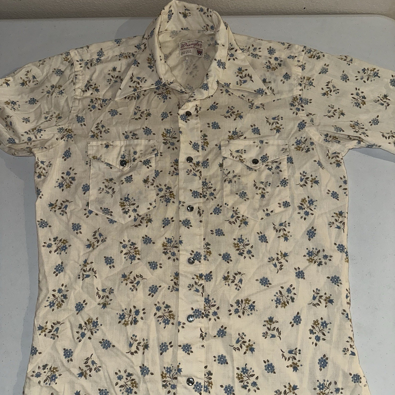 Vintage 70s Wrangler Pearl Snap Floral Shirt Western USA Long Tails Sz 15.5x35