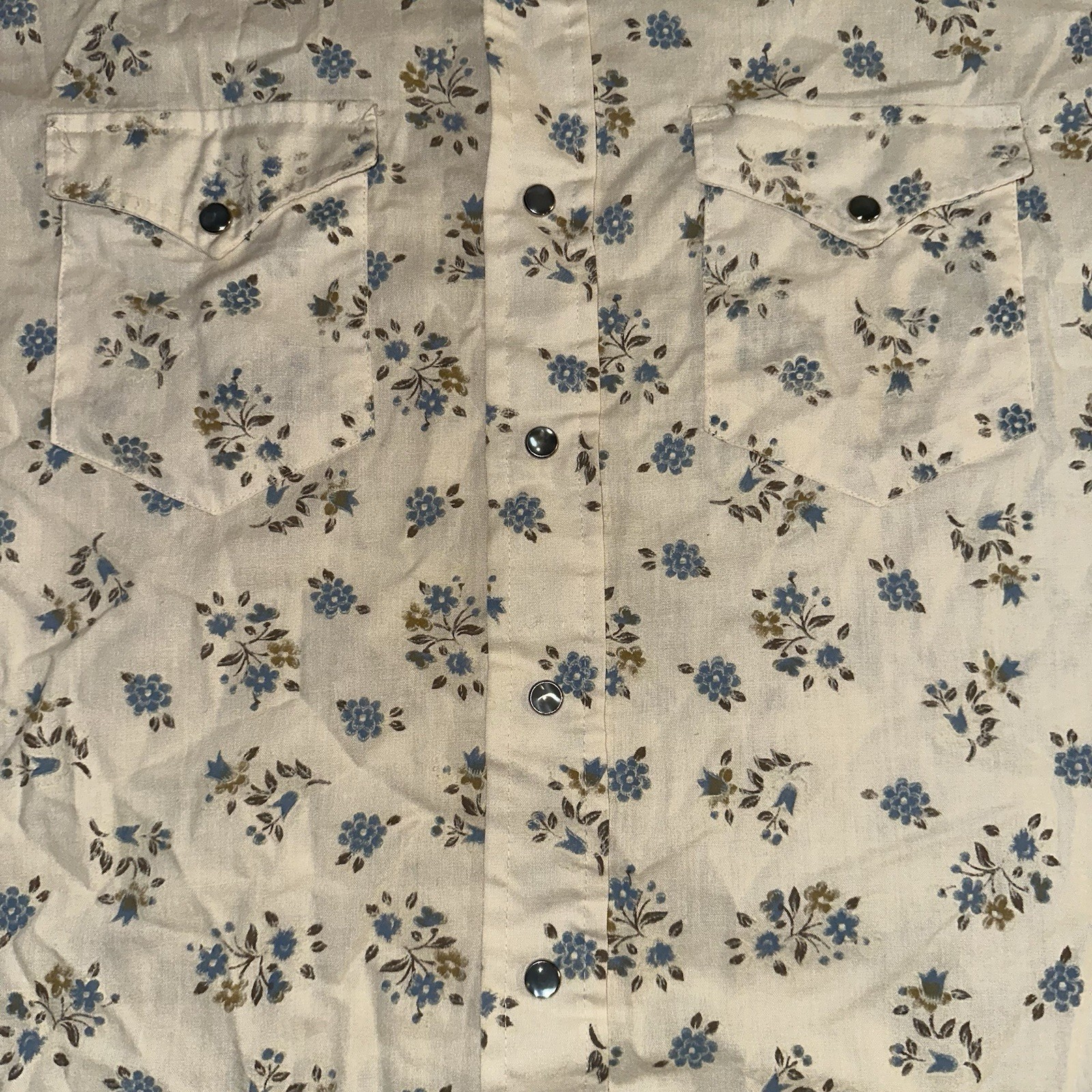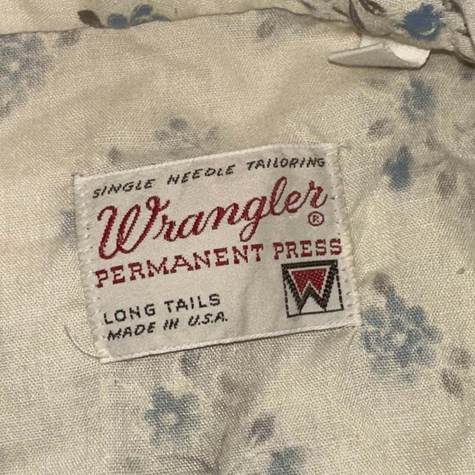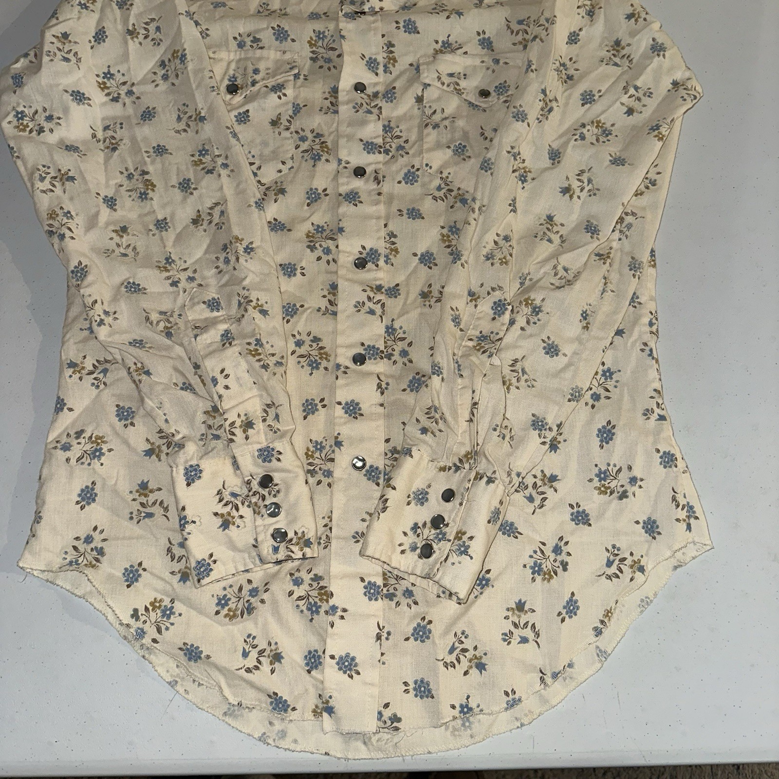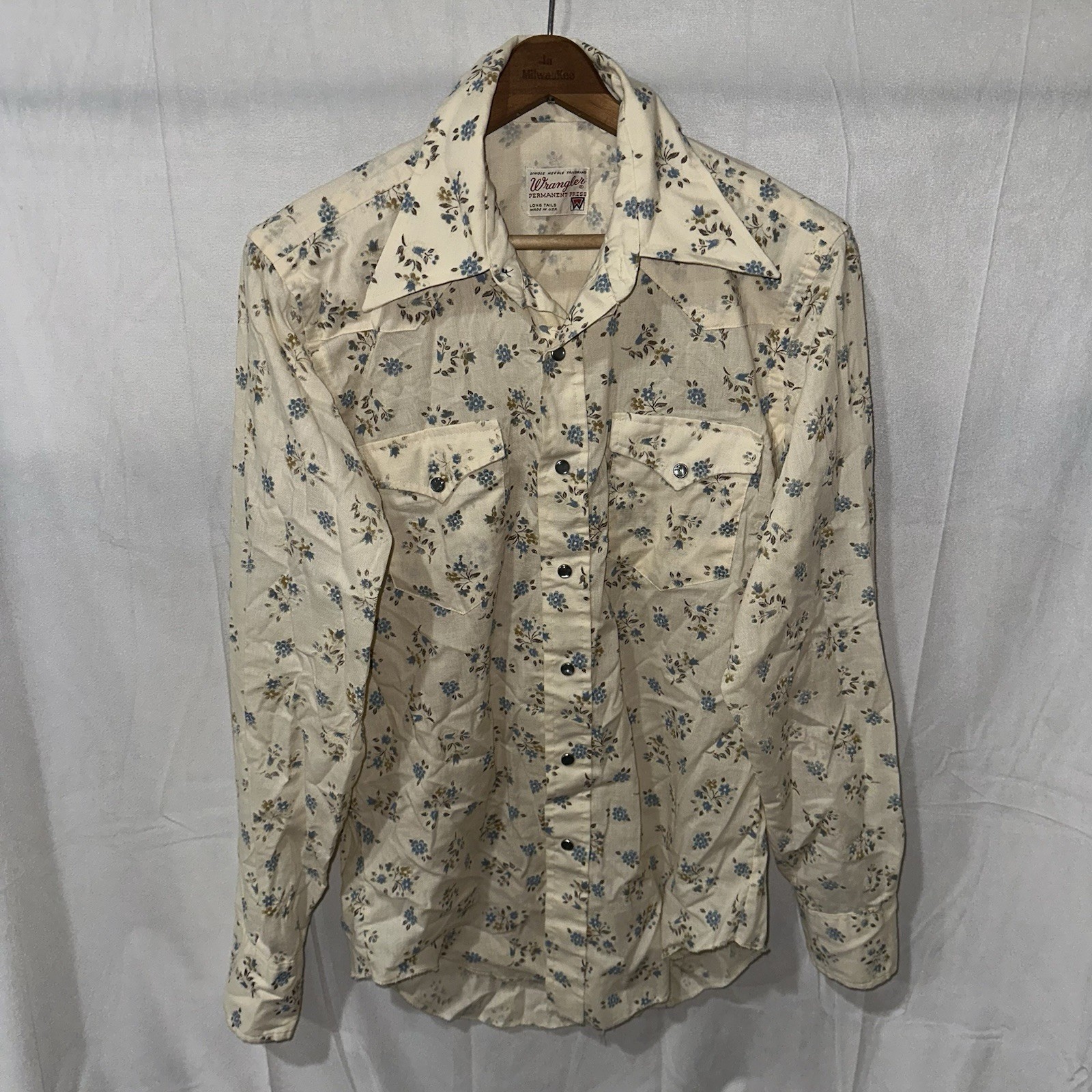 Vintage 70s Wrangler Pearl Snap Floral Shirt Western USA Long Tails Sz 15.5x35