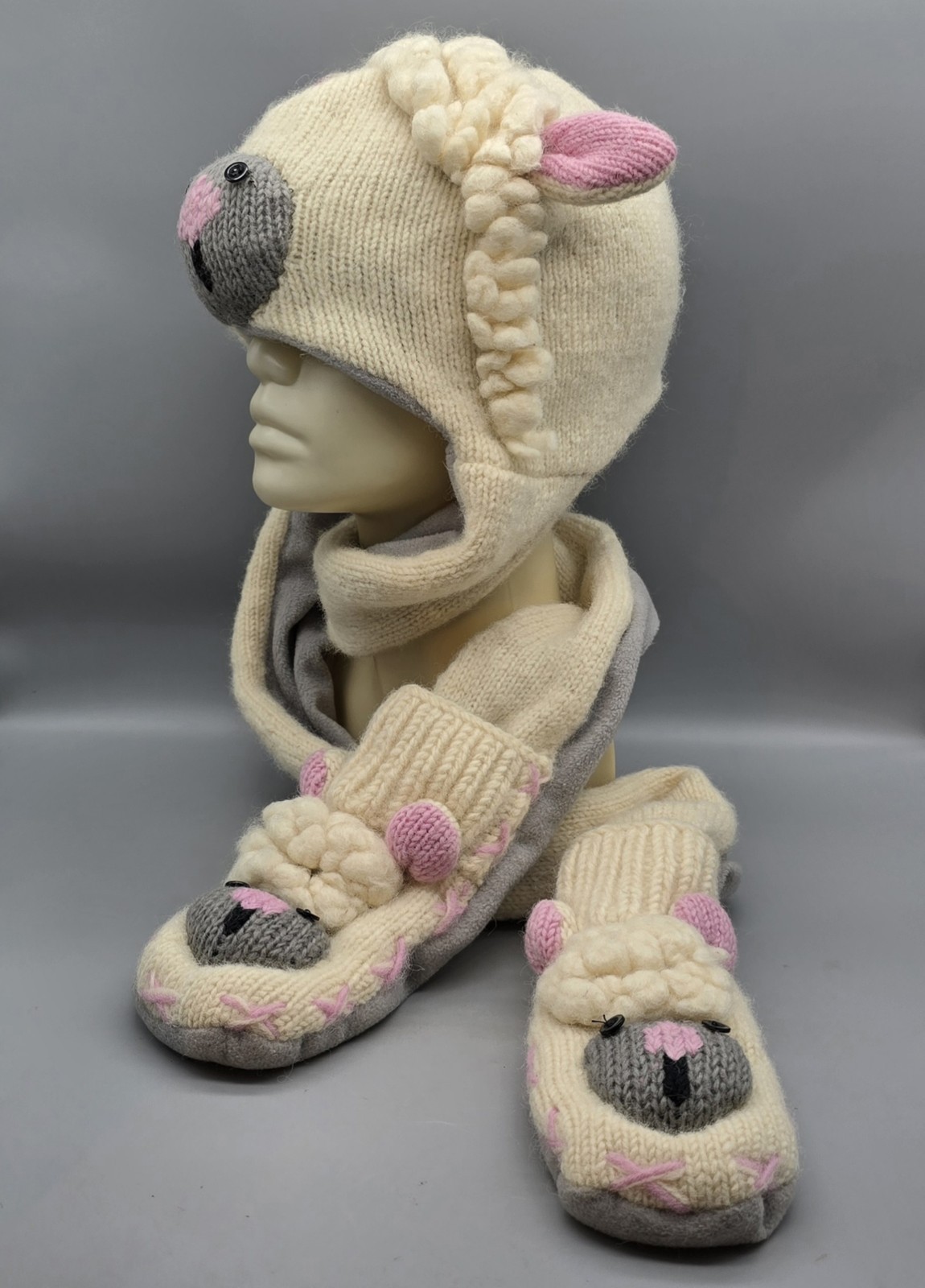 Nepal Wool Lamb Hat-Scarf-Mitten Combo, Fleece Lined, One Size Fits Most