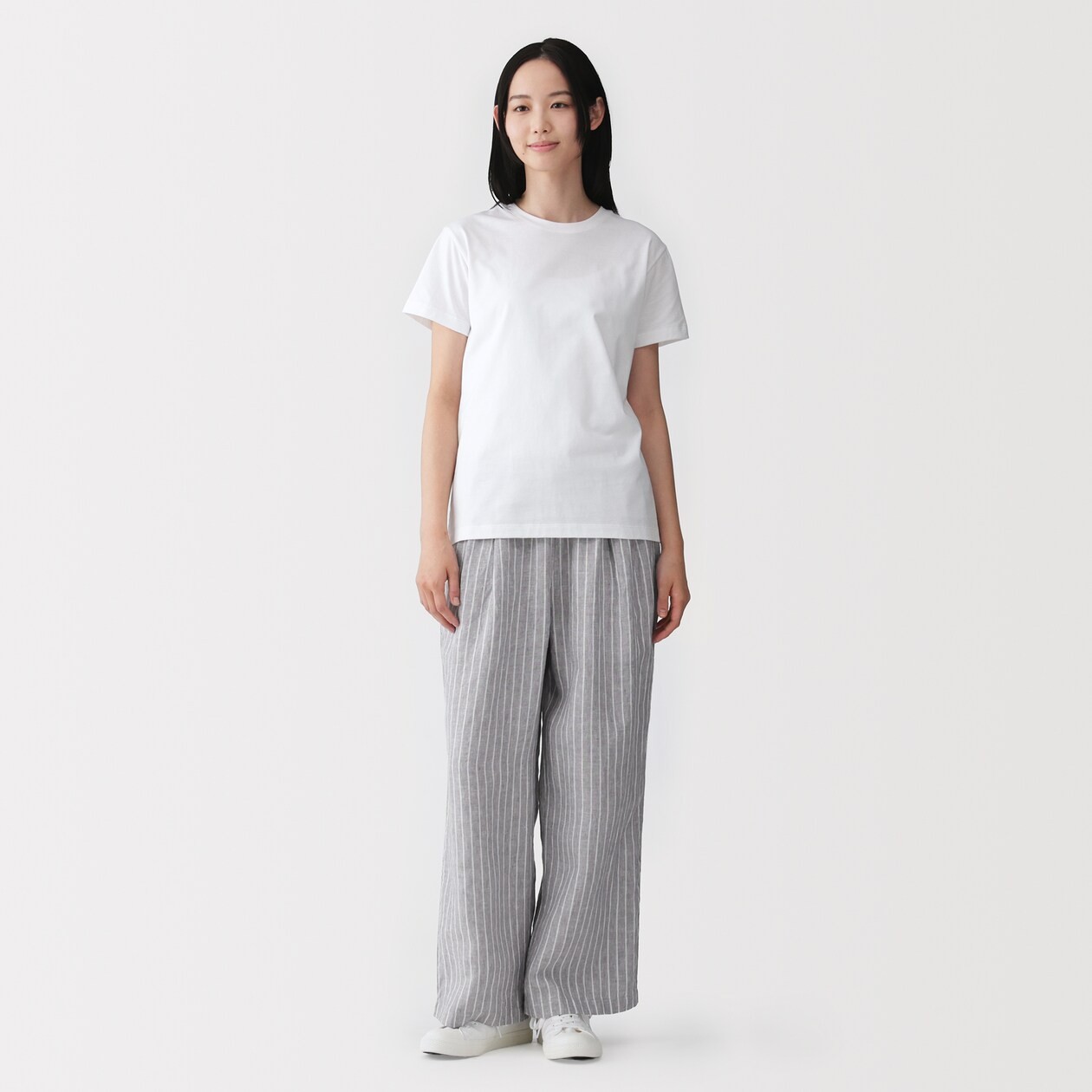 MUJI Womens 100 Linen Washed Easy Wide Pants Gray Stripe FedEx