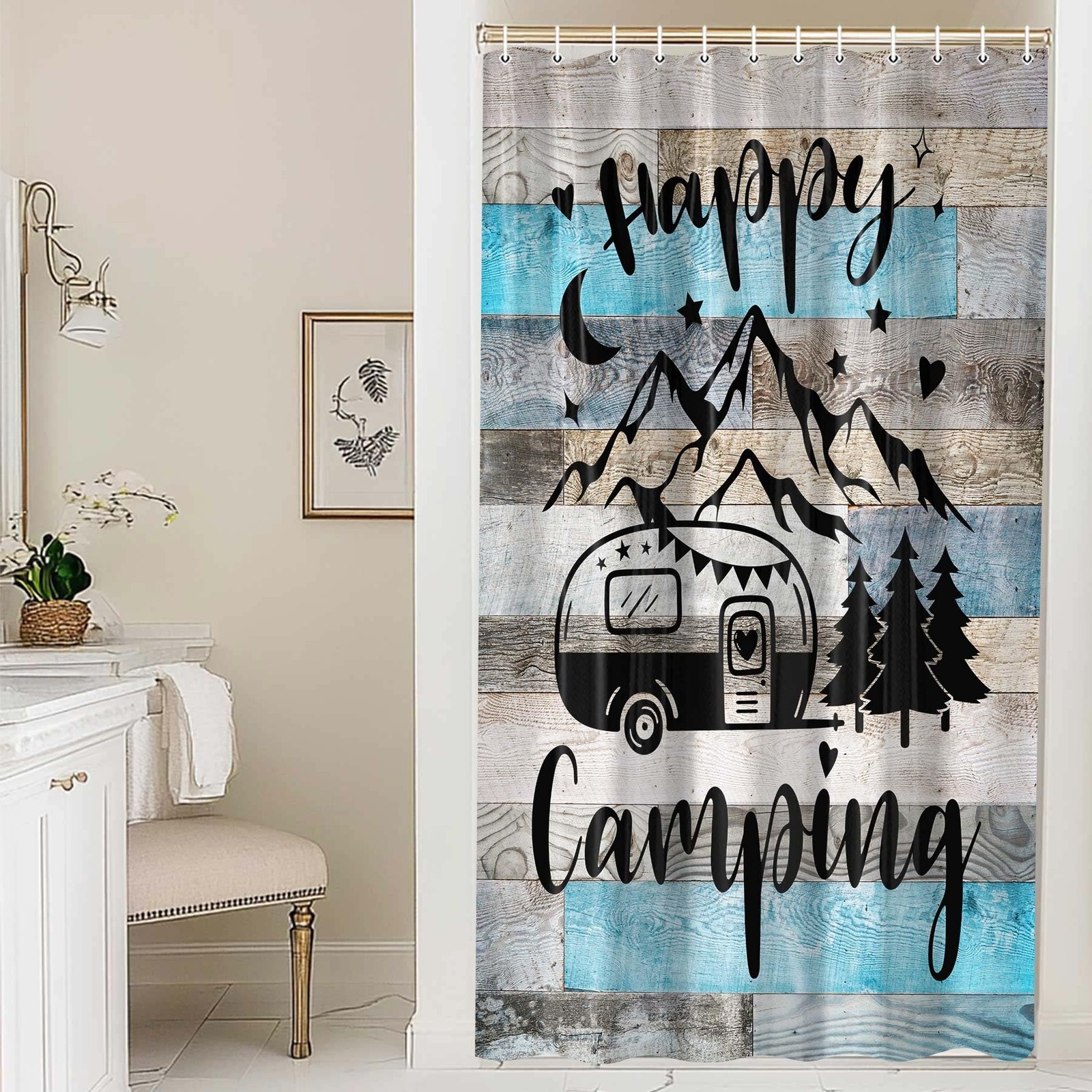 RV Shower Curtain Bathroom Happy Camping Blue Gray Barn Door 47X64 Inch