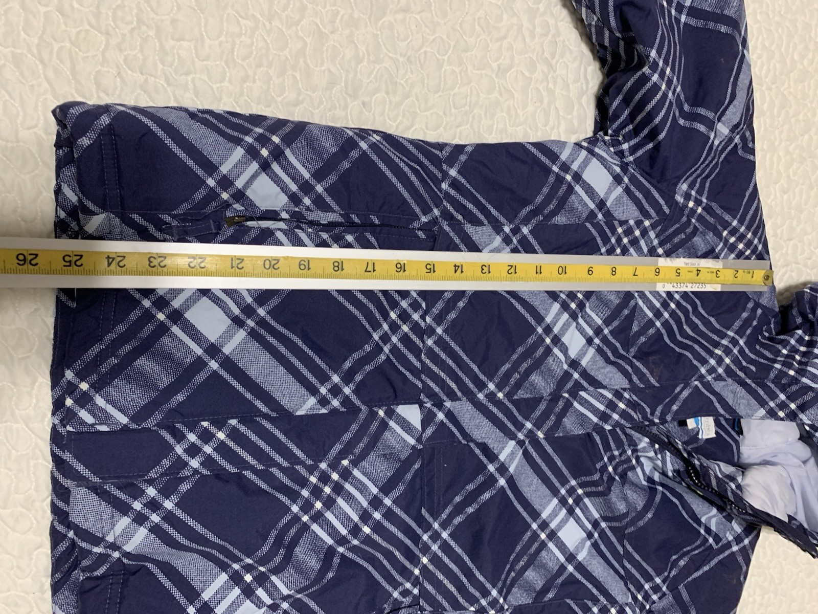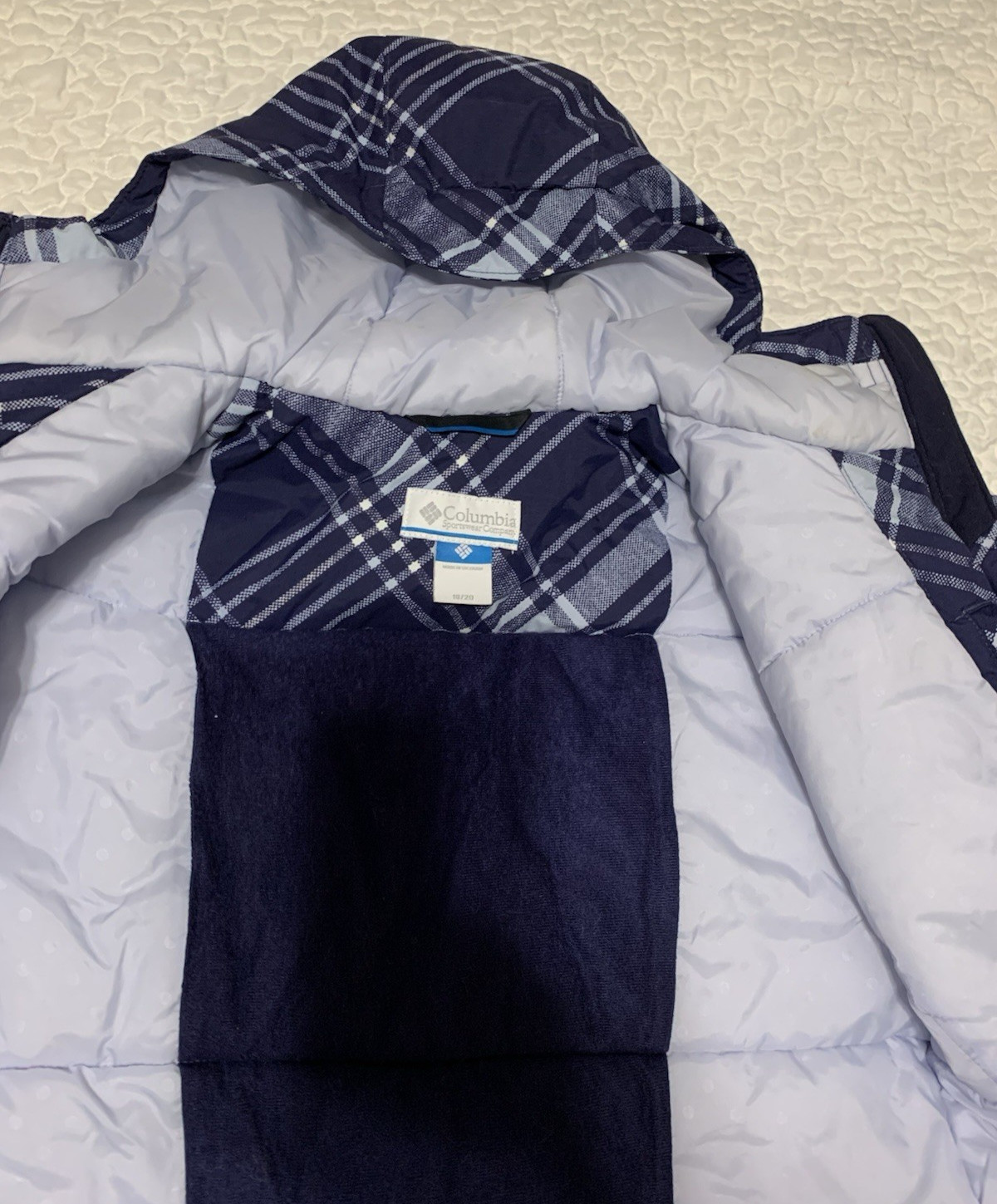 как выглядит Columbia Omni Shield youth 18/20 hooded Jacket coat blue/white plaid фото