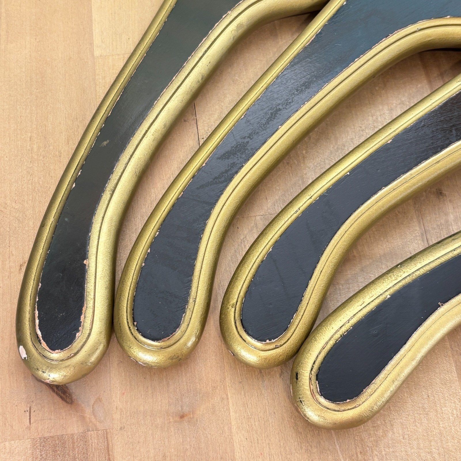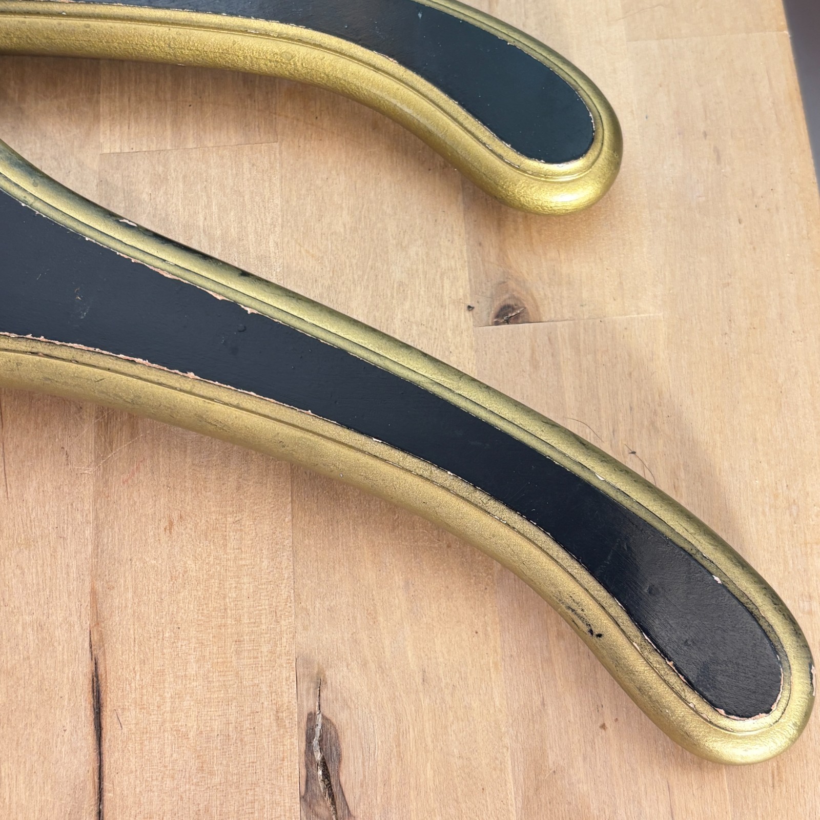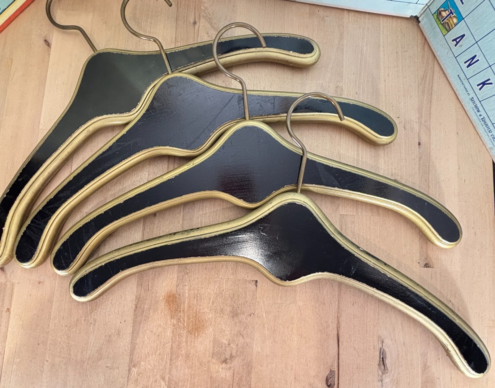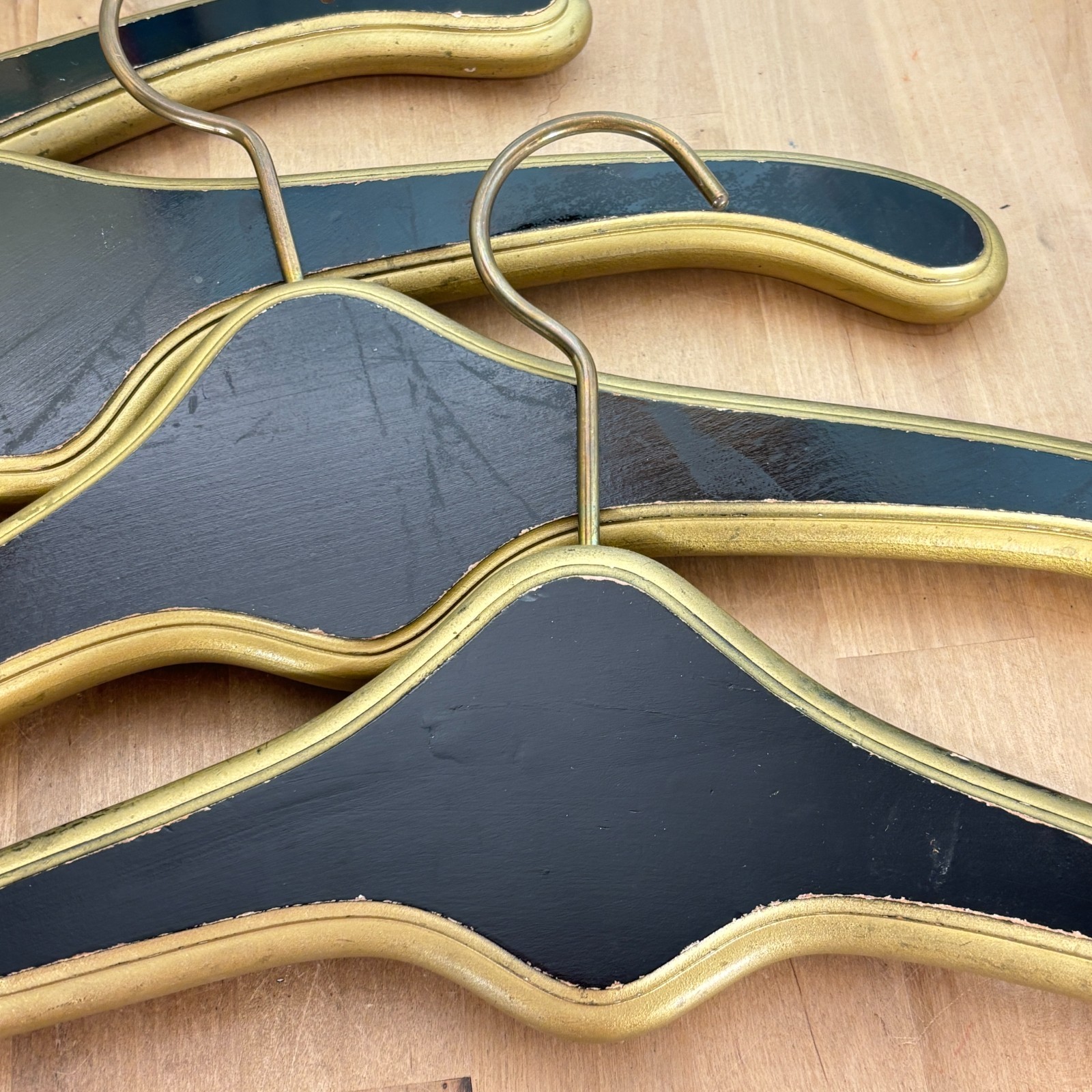 как выглядит Hollywood Regency Wooden Monogrammed W Clothes Hangers Black Gold Lot of 4 фото