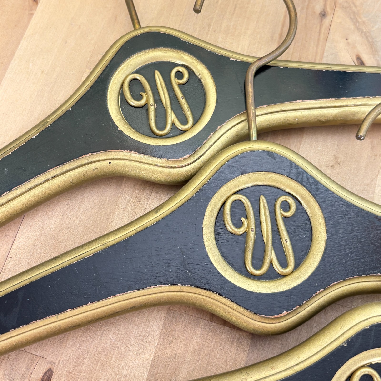 Hollywood Regency Wooden Monogrammed W Clothes Hangers Black Gold Lot of 4