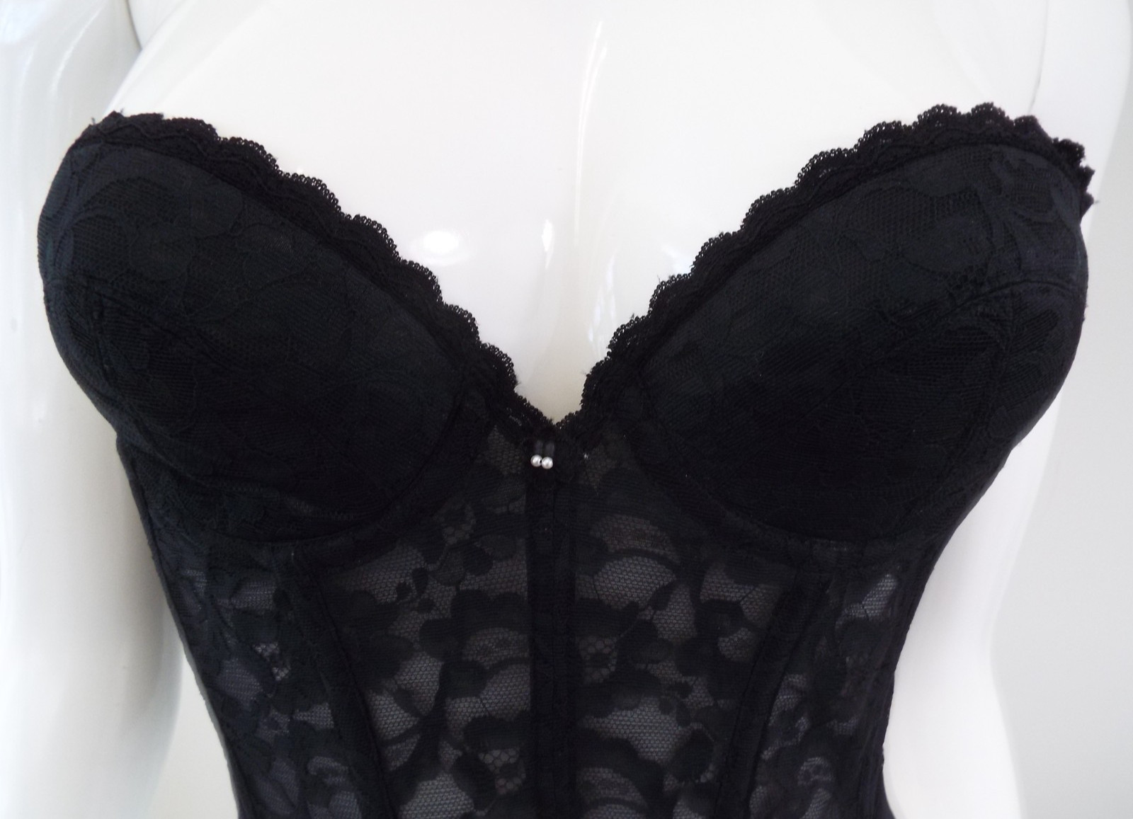 как выглядит Vintage Fredericks of Hollywood Black Lace Bustier 5805 34B Corset Bra Boning фото
