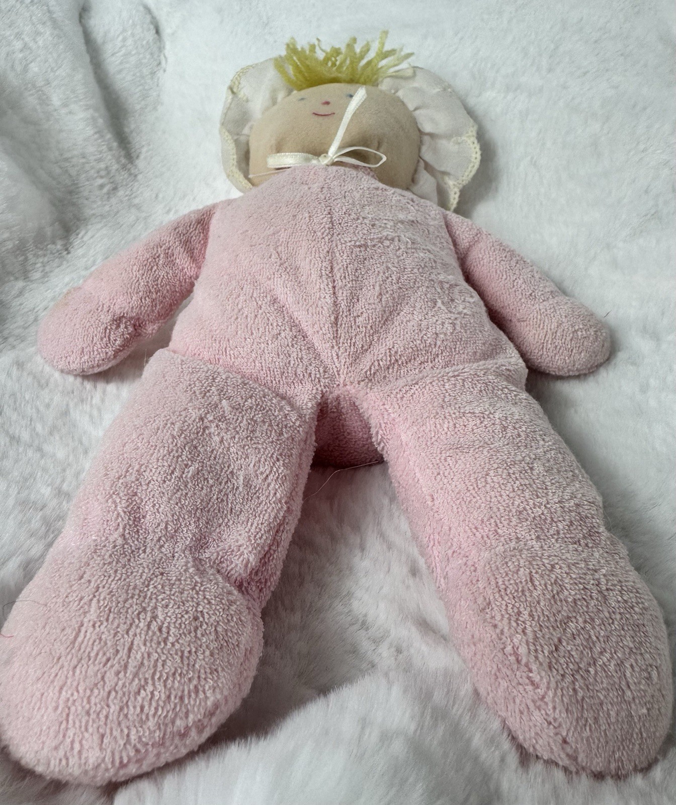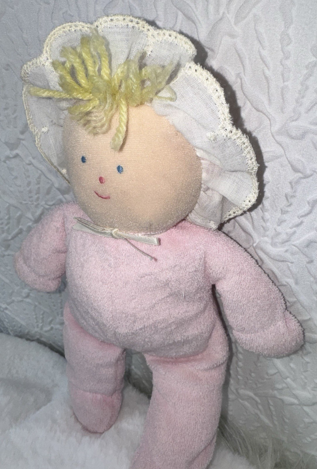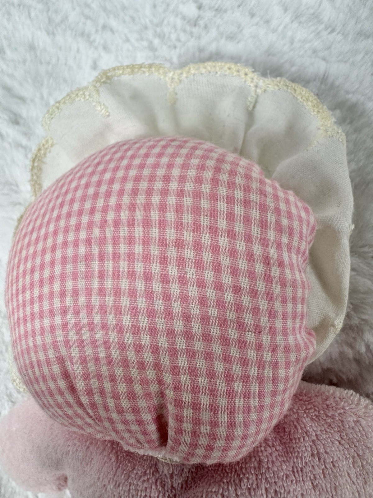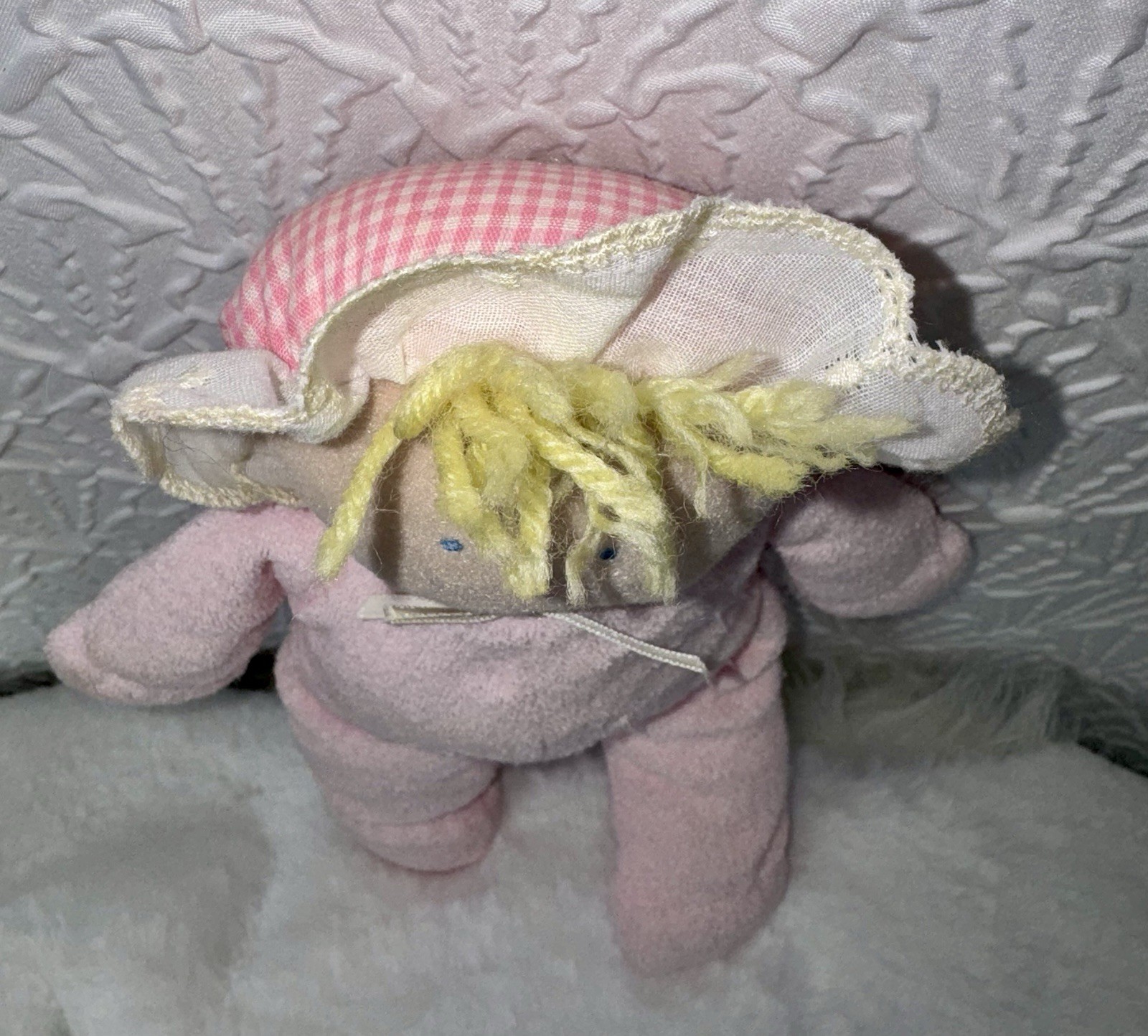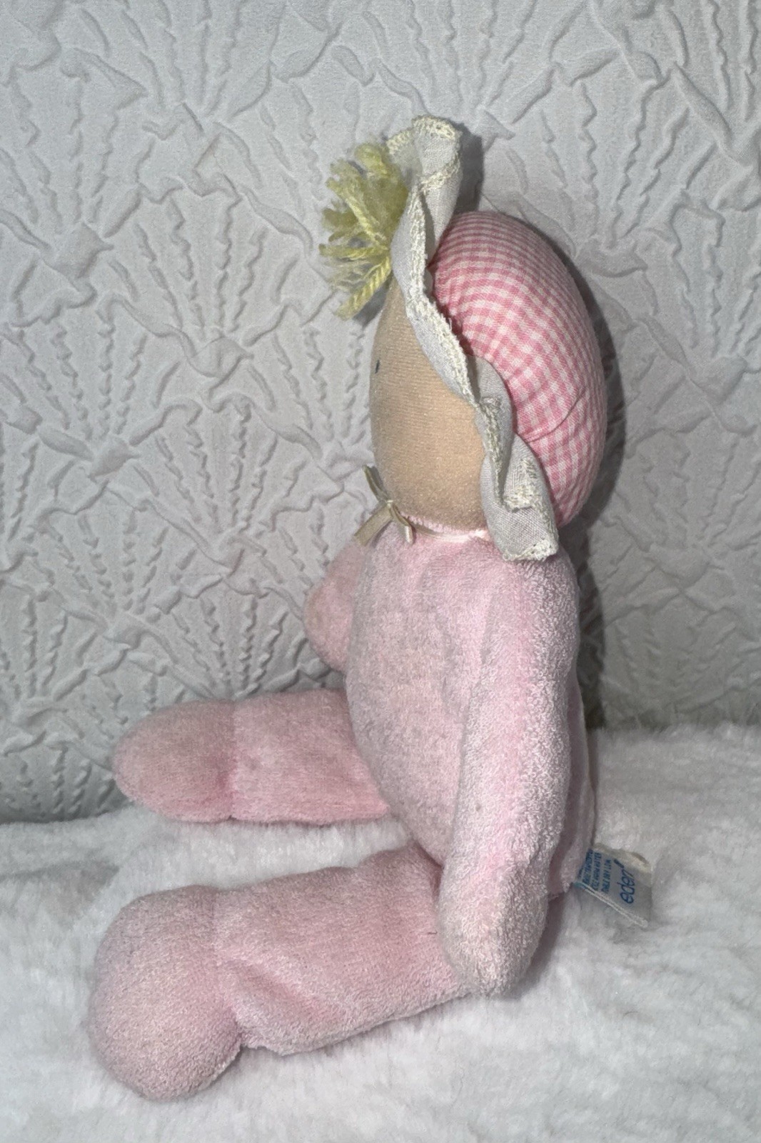 как выглядит Vintage Eden Plush Doll Pink Terry Cloth Blonde Yarn Hair 10" Lovey Gingham Hat фото