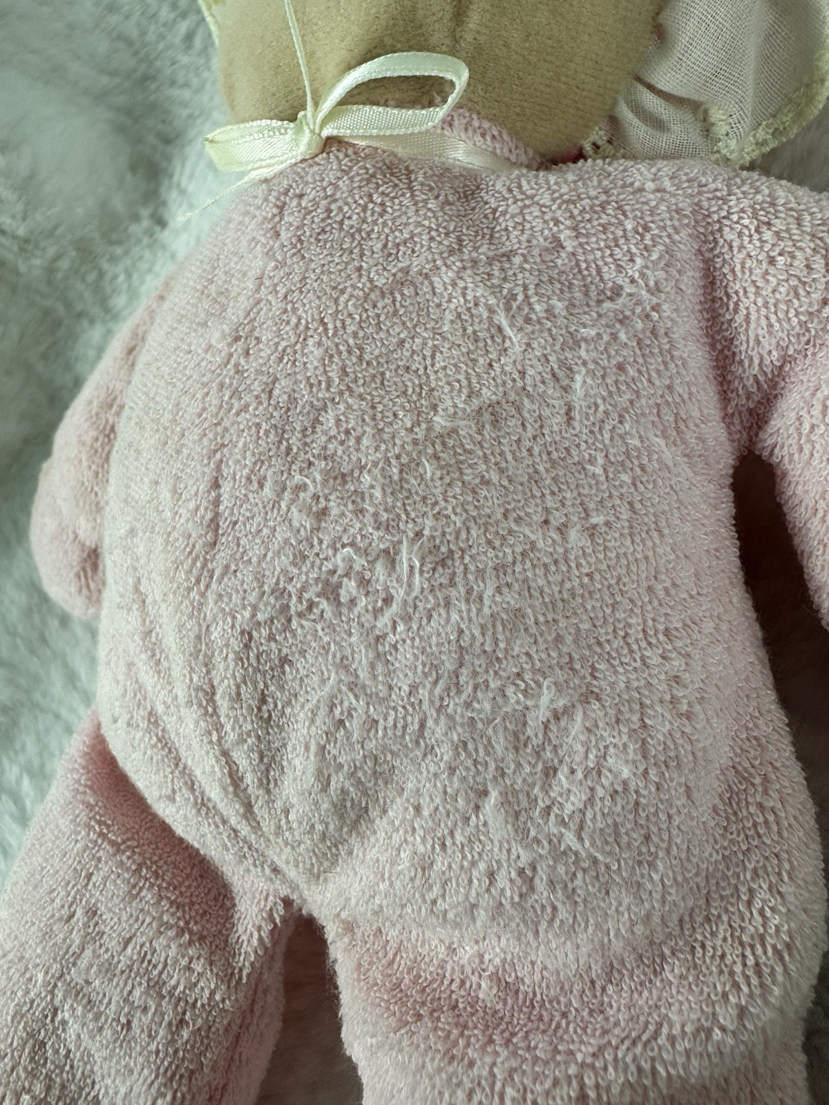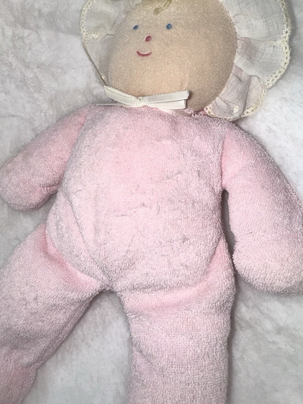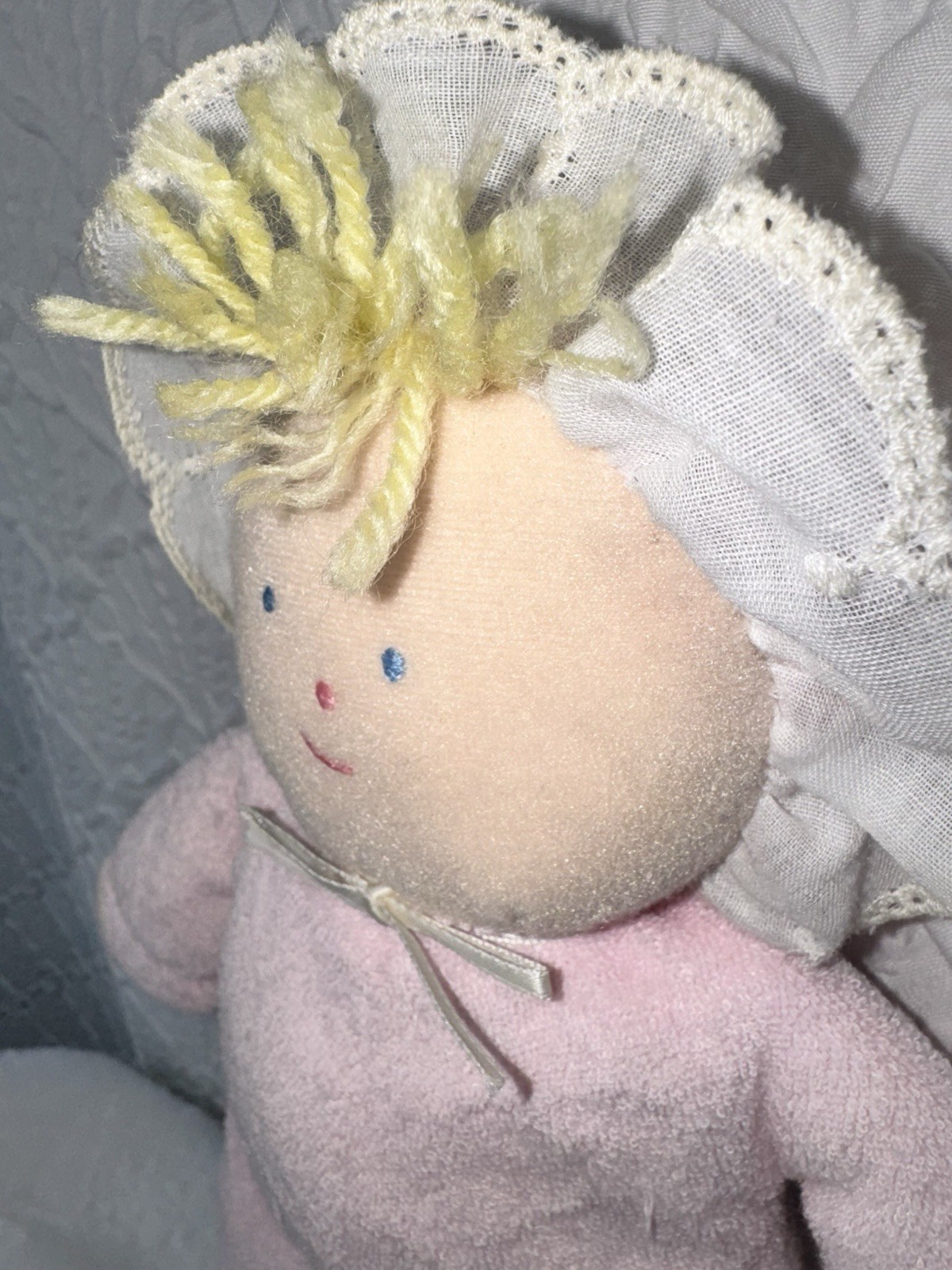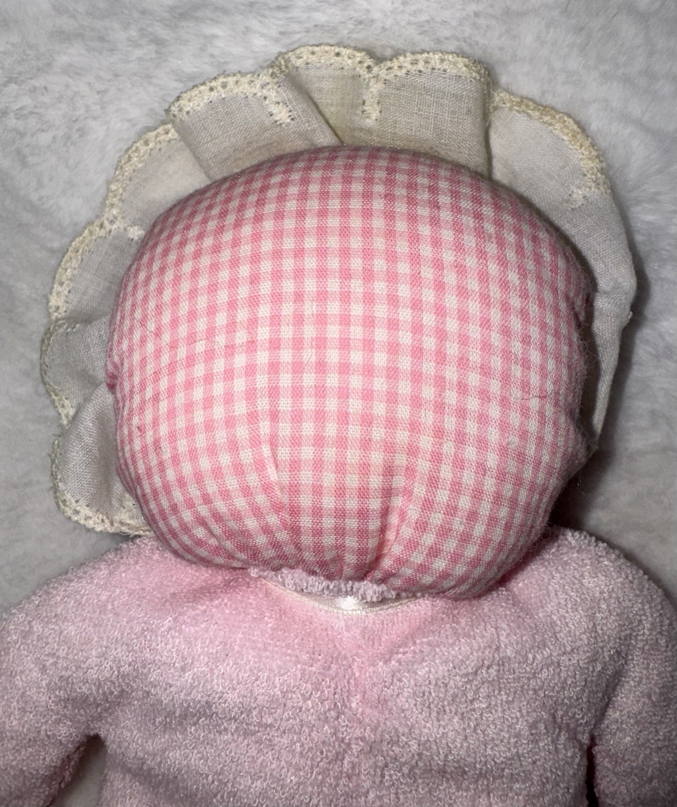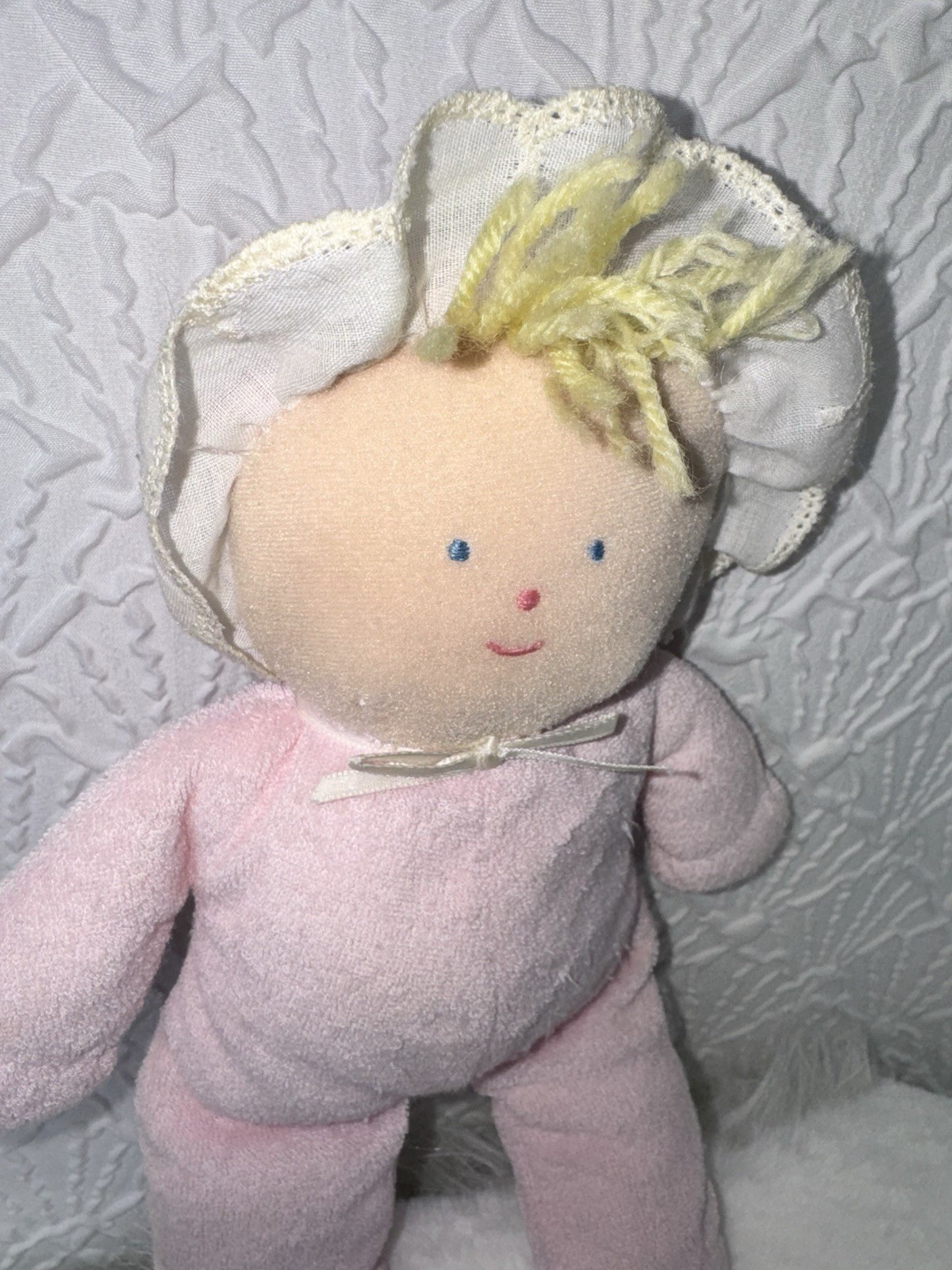 как выглядит Vintage Eden Plush Doll Pink Terry Cloth Blonde Yarn Hair 10" Lovey Gingham Hat фото