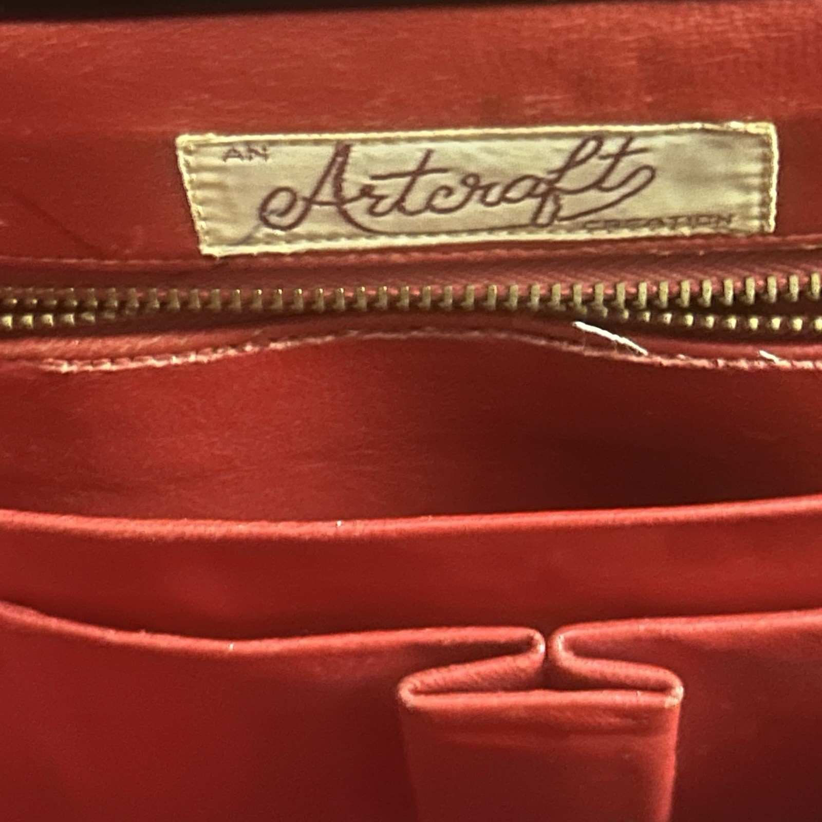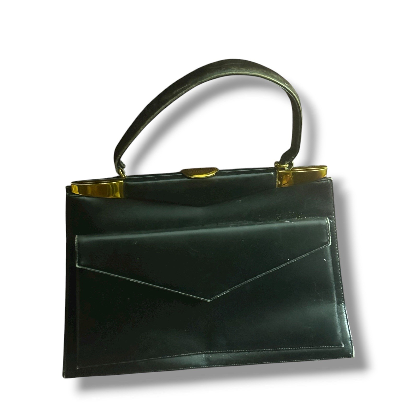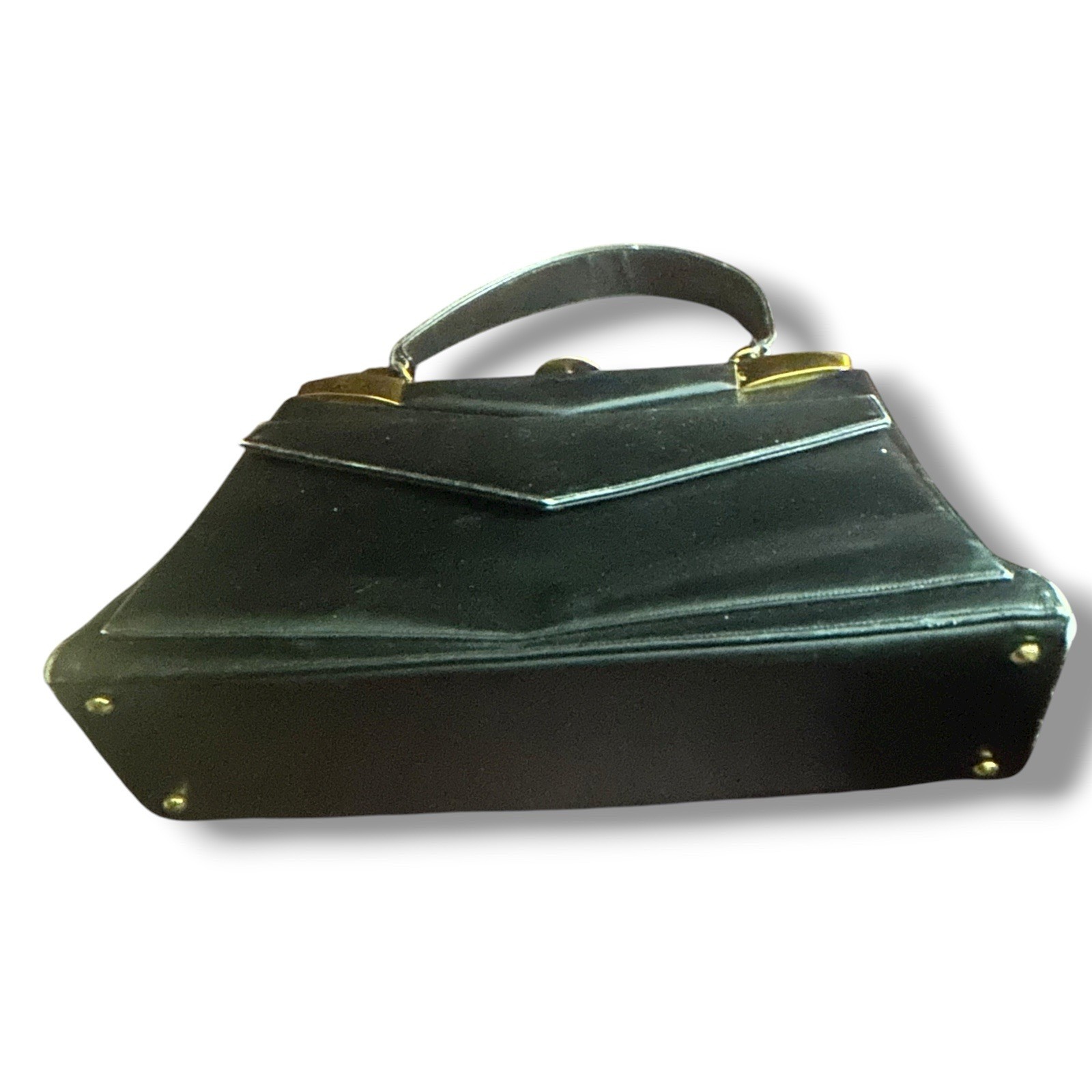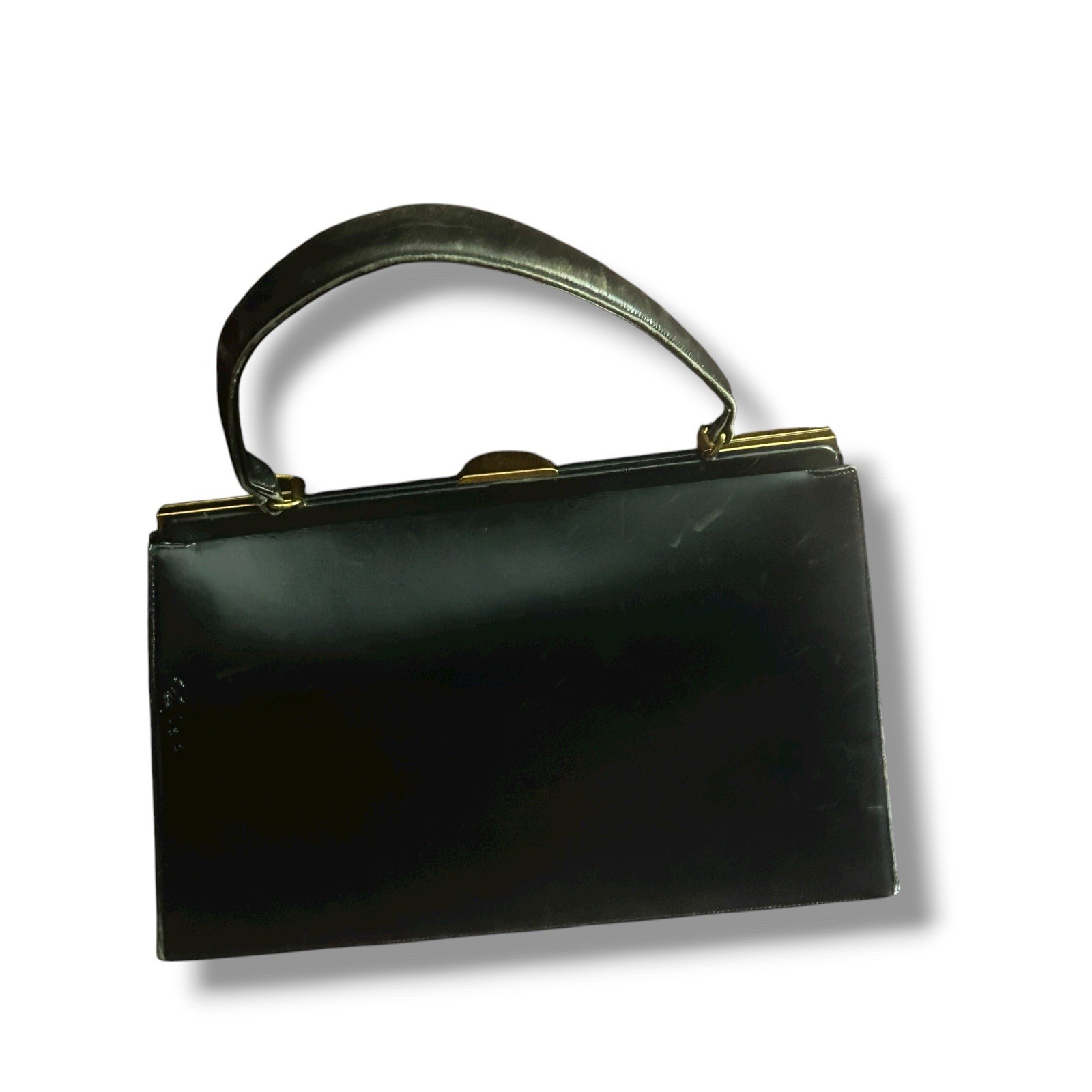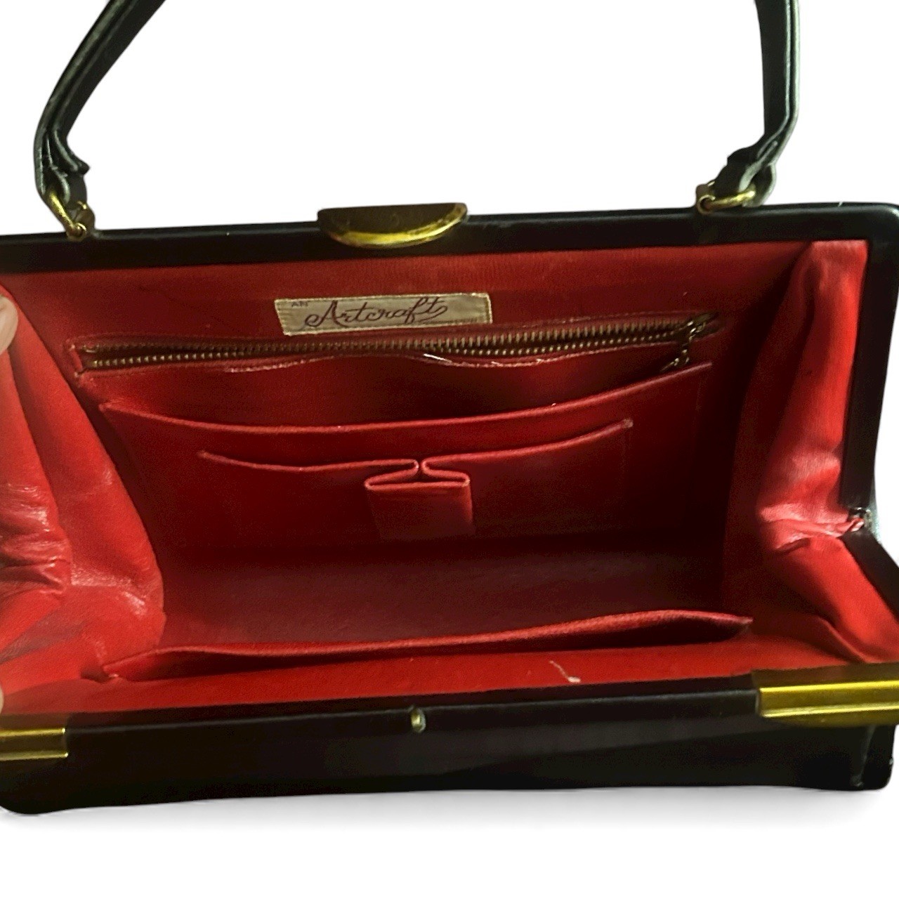 как выглядит Vintage 1950s Artcraft Black Patent Handbag Red Lining w/ Mirror Gold Frame фото