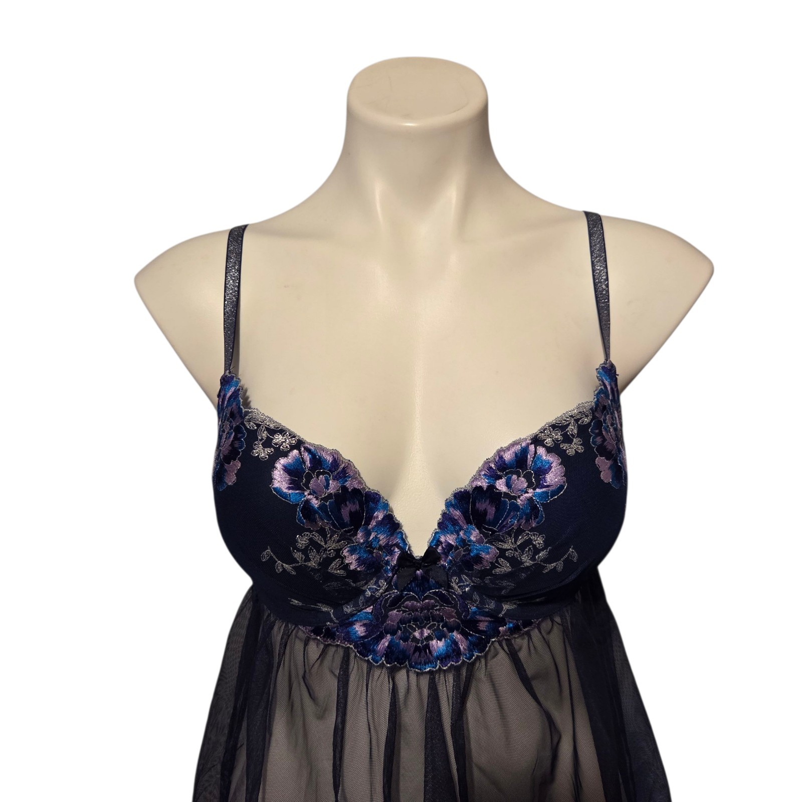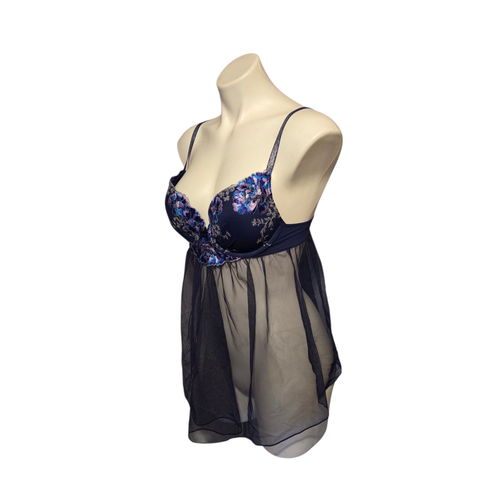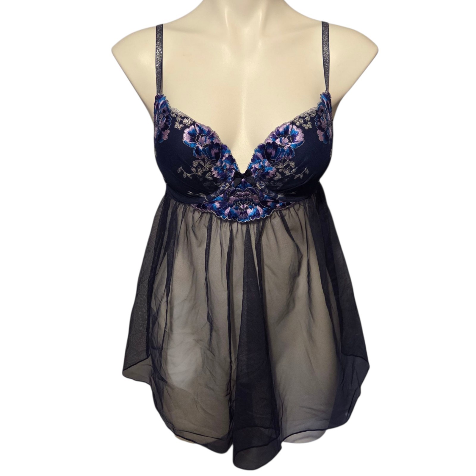 Victoria's Secret Baby Doll Nightie Size 34 C Blue Floral Tulle Lingerie 34C