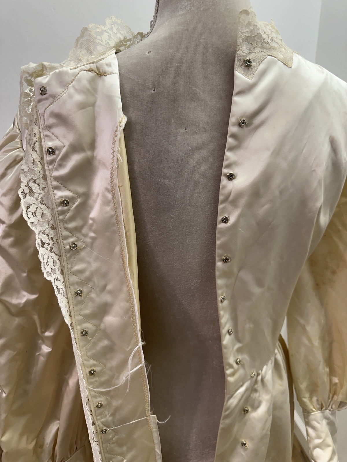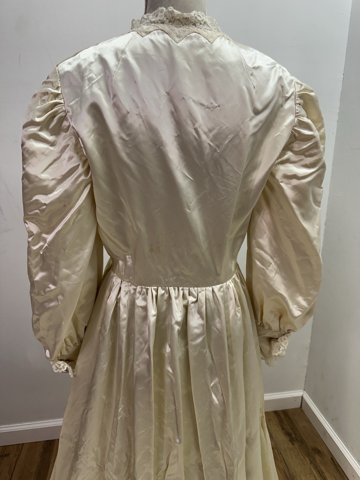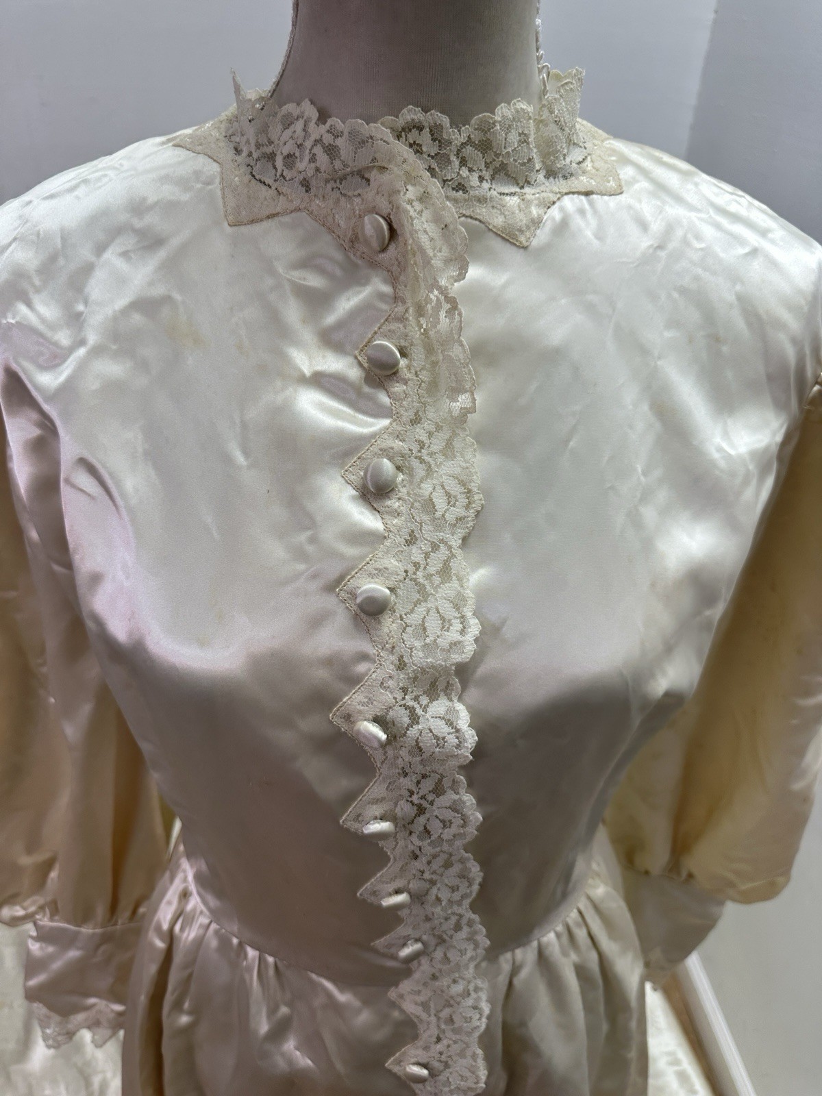 как выглядит Vintage Antique Satin Cream Wedding Dress Button Front Edwardian Medium FlAw фото