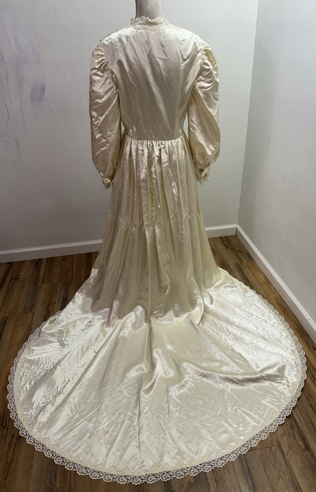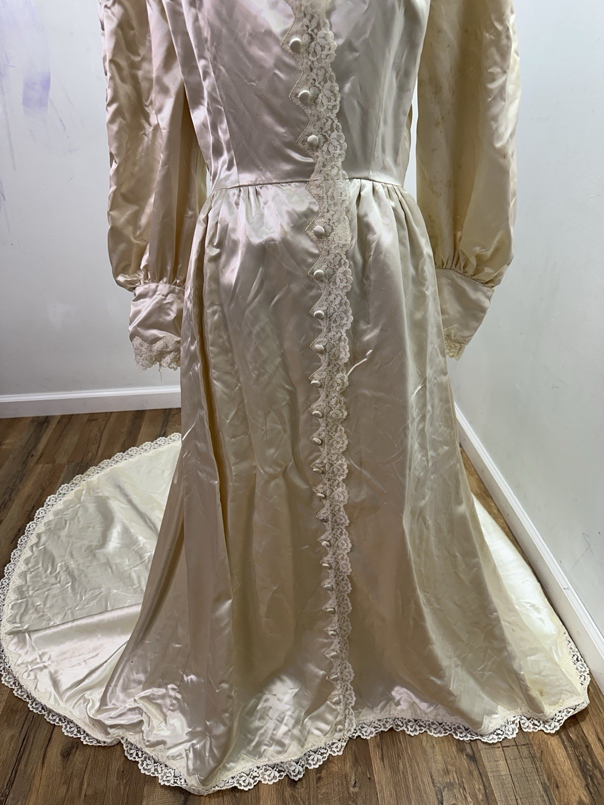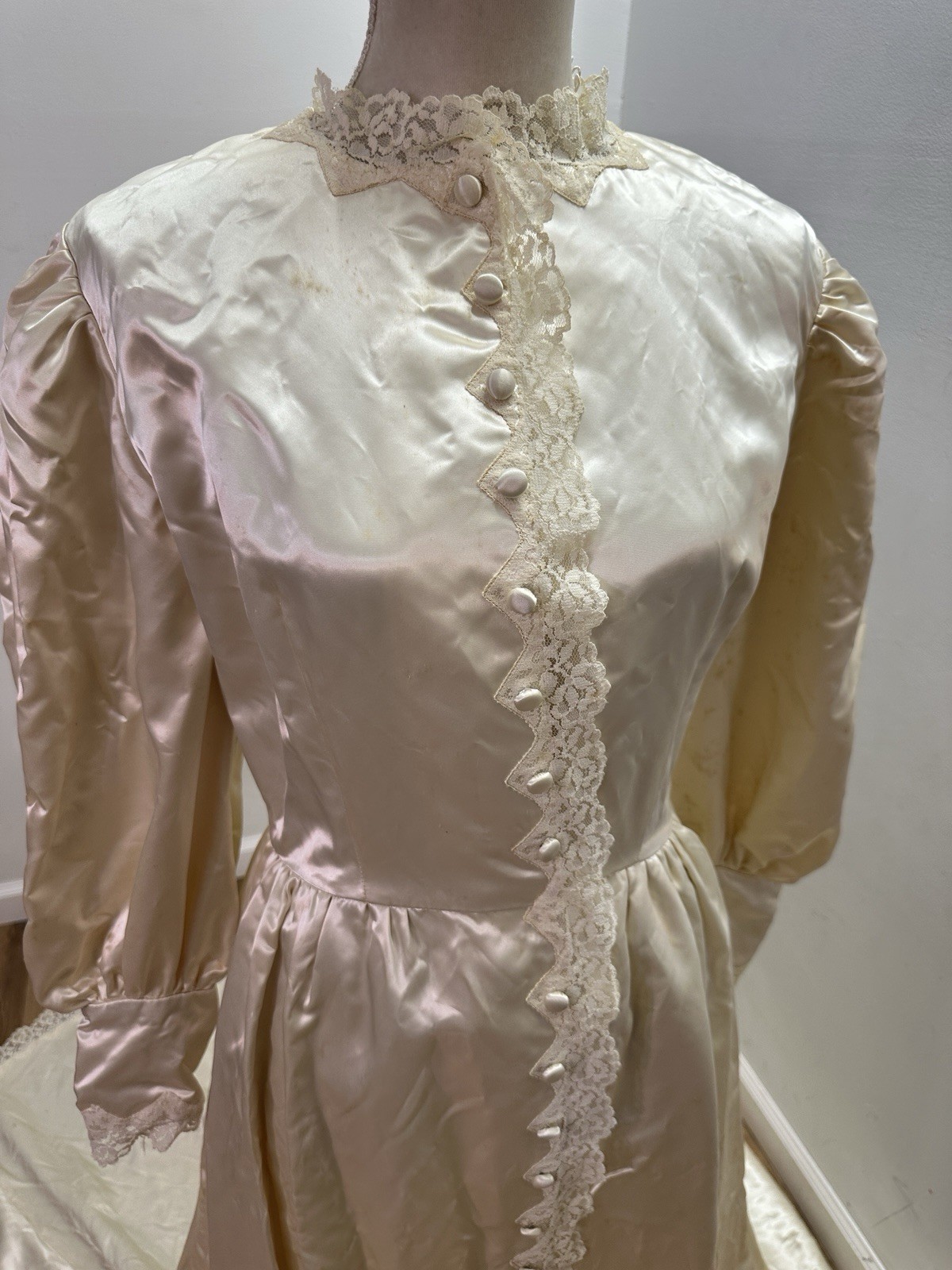 как выглядит Vintage Antique Satin Cream Wedding Dress Button Front Edwardian Medium FlAw фото