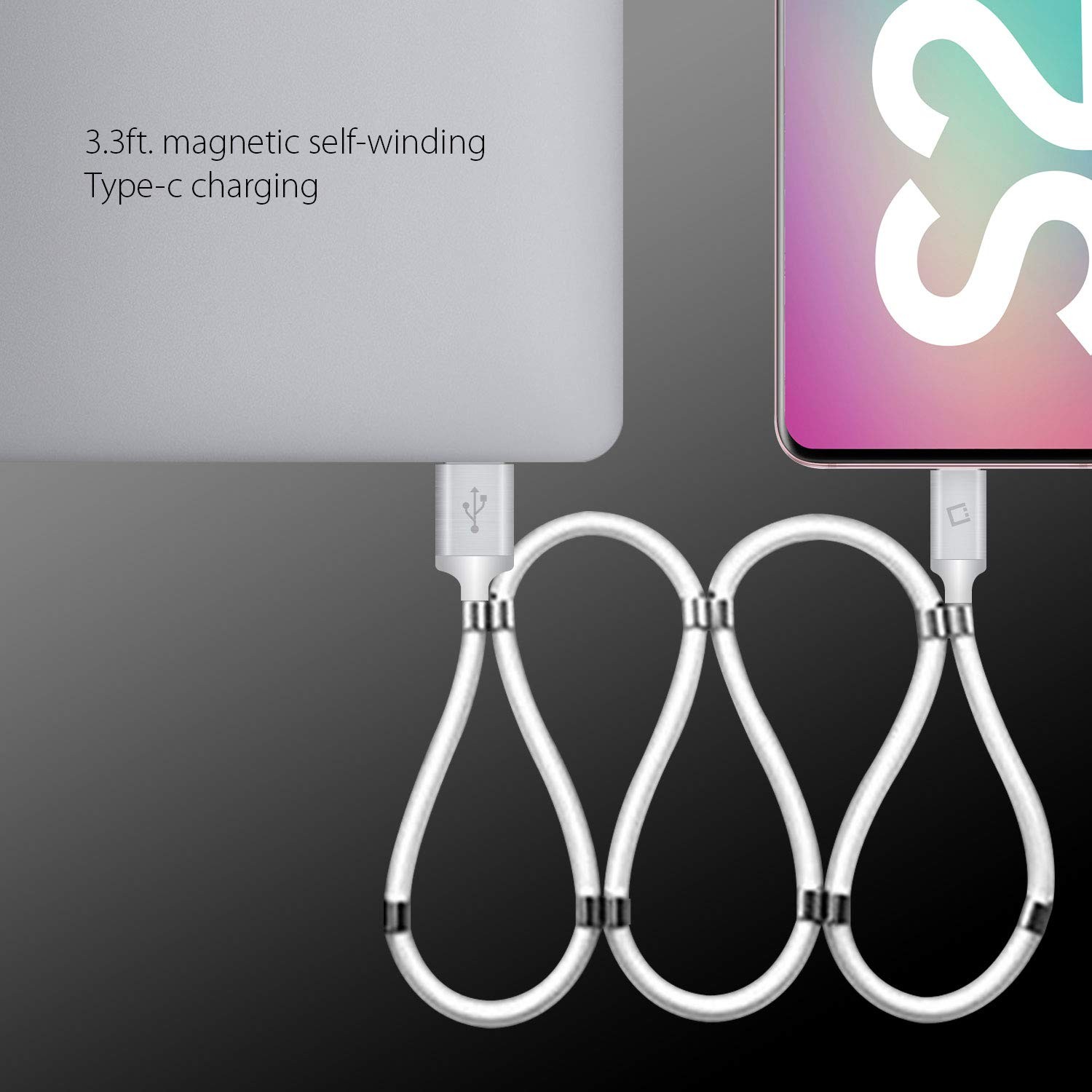 USB-C Charging Cable, Magnetic Self Winding Type-C 3.3 feet, BLACK