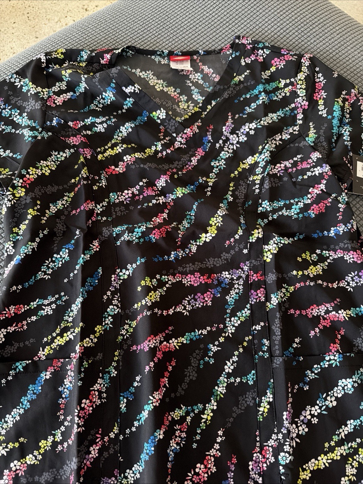 NWT Dickies Women s Scrub Top Size L Black Floral Design V Neck DK656