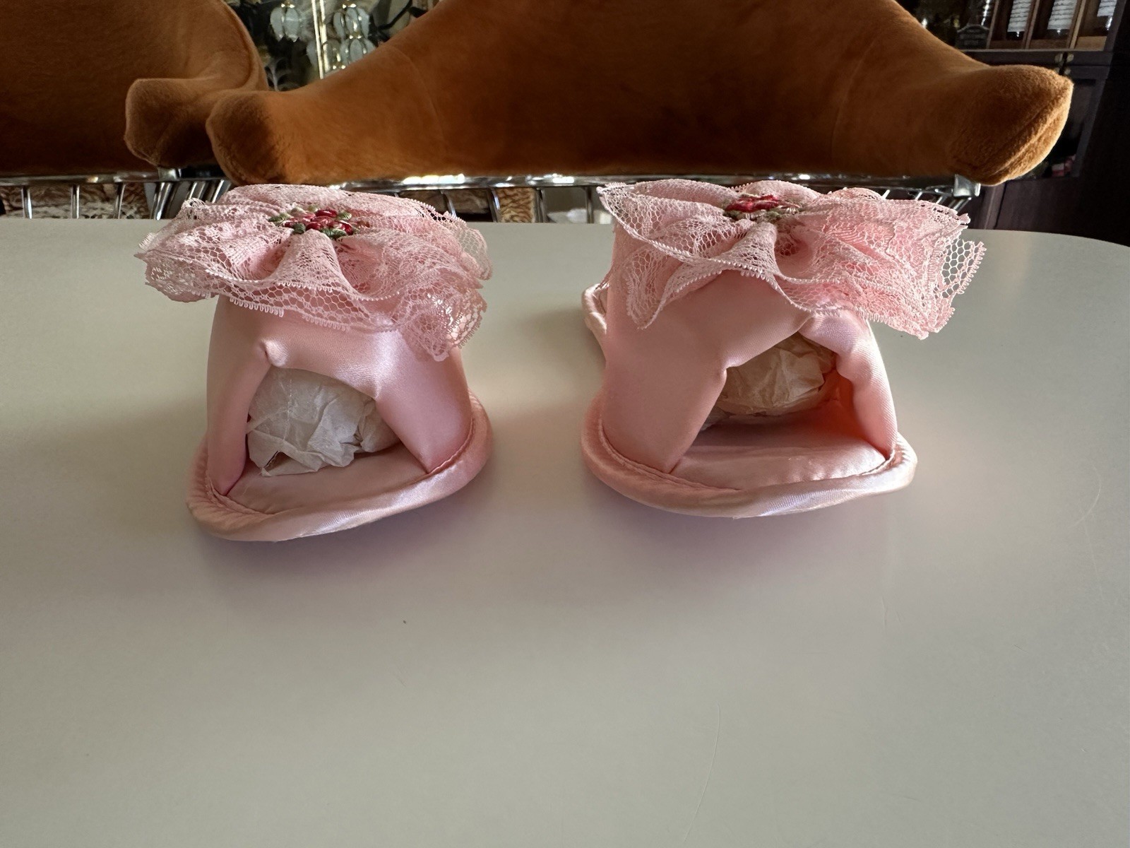 как выглядит NIB 1960s Scuff-A-Bouts Pink Satin Boudoir Slippers Lace Floral Rosette MCM VTG фото