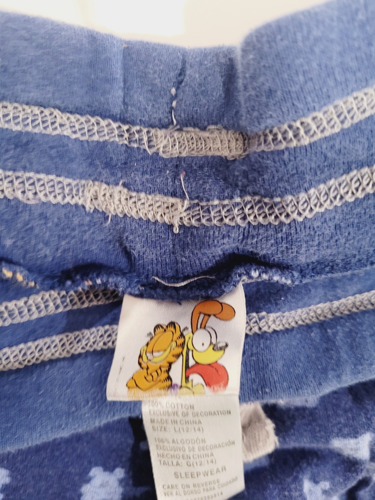 как выглядит Vintage Garfield Odie PJ Pajama Pants Size L 12/14 Unisex Drawstring Blue фото