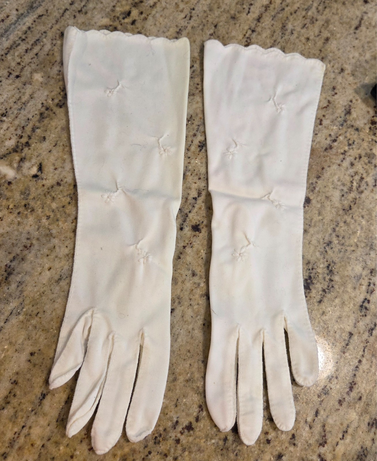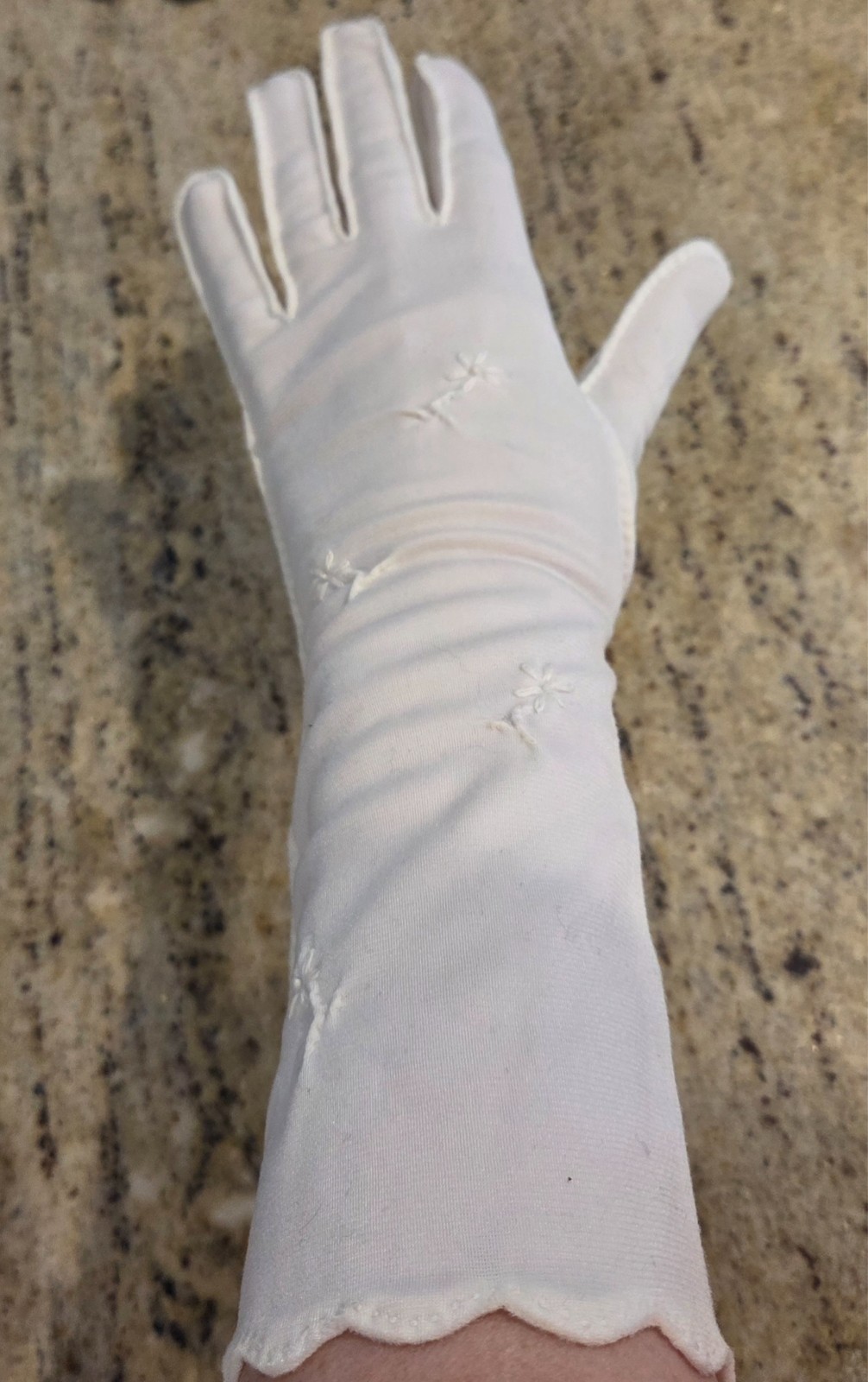 Vintage Women Sz M/L Off-White Nylon Formal 13 Long Gloves Embroidered Flower