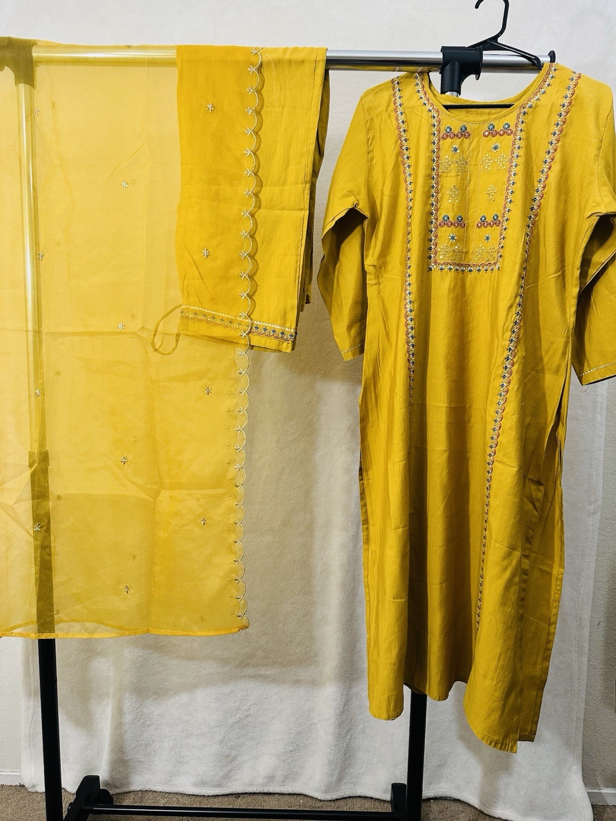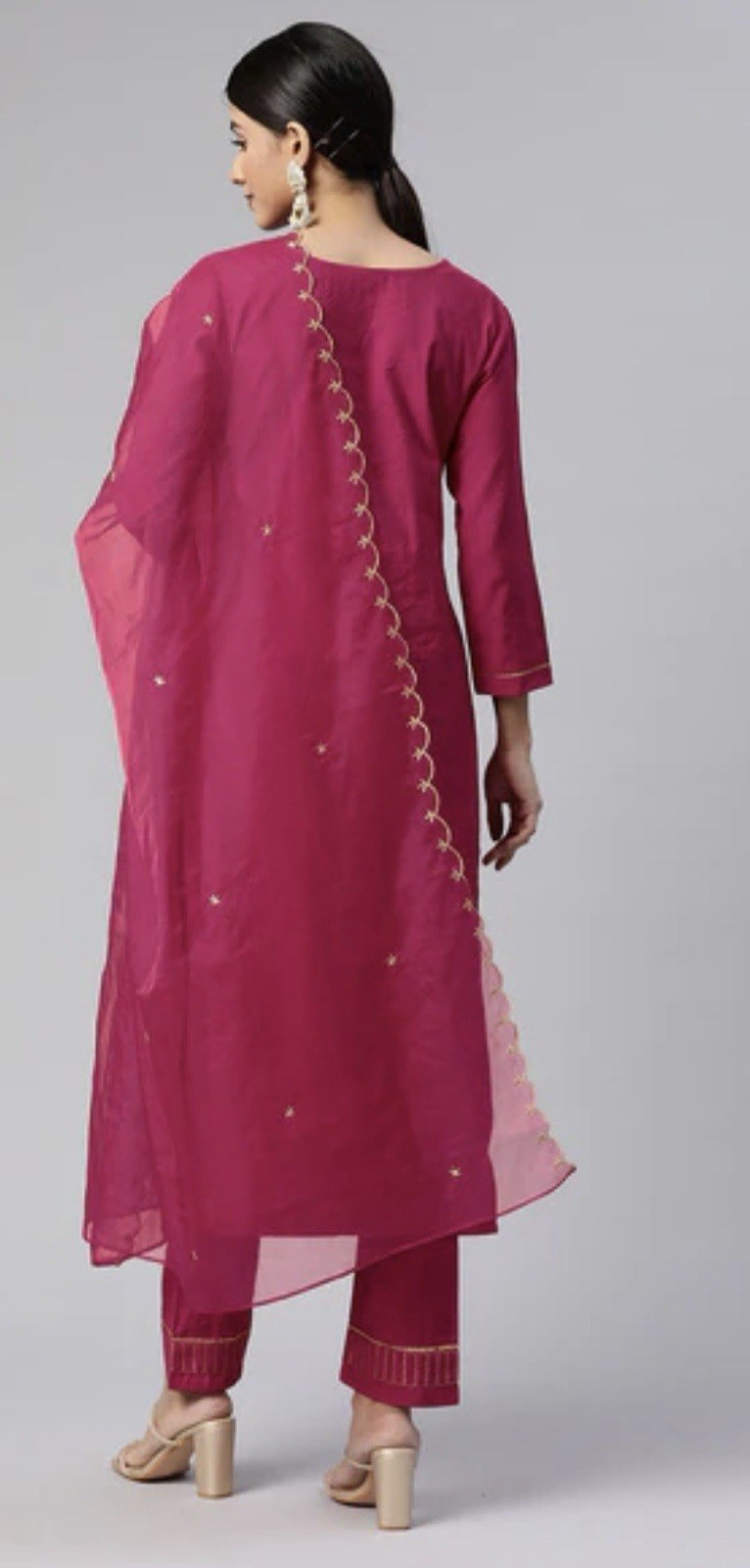 как выглядит Indian designer Wear 3/4 Sleeve Silk Blend Embroidered Kurta With Trousers фото