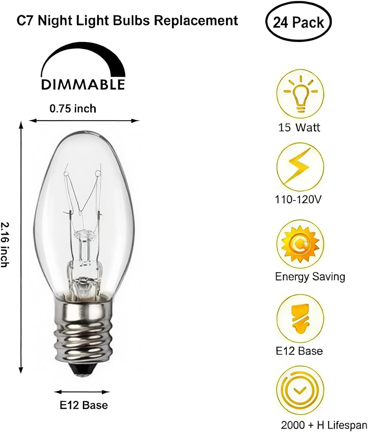 24 Pack C7 Night Light Bulbs, 15 Watt Night Light Bulbs Dimmable, E12 Candelabra