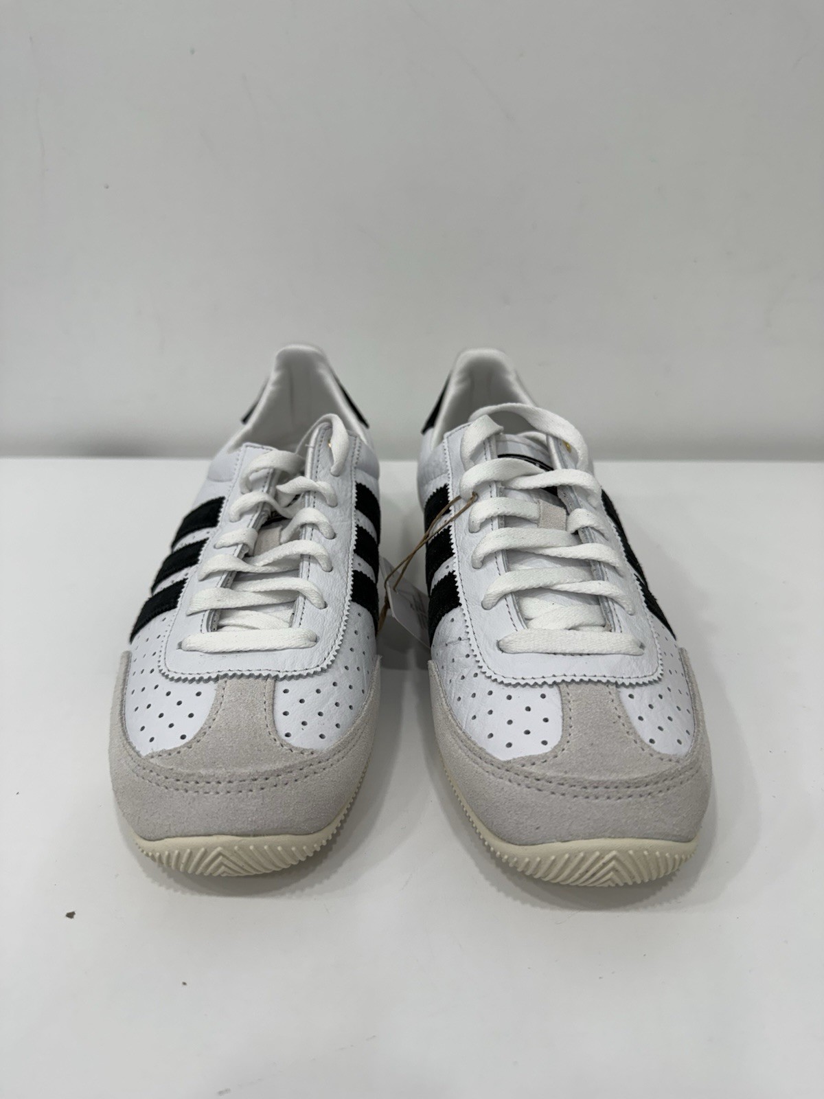 Accents: "adidas Japan" written in gold on the outside lateral, Tumbled perforated leather upper, Padded Collar, Black Heel Top Matching the 3 Stripes, Contrasting Black 3 Stripes Stiched on each Lateral, Off-white Suede double-stitched T-toe and Heel counter, "Adidas Japan" Branded Tongue, "adidas" and Trefoil Branded Heel Top and Insoles