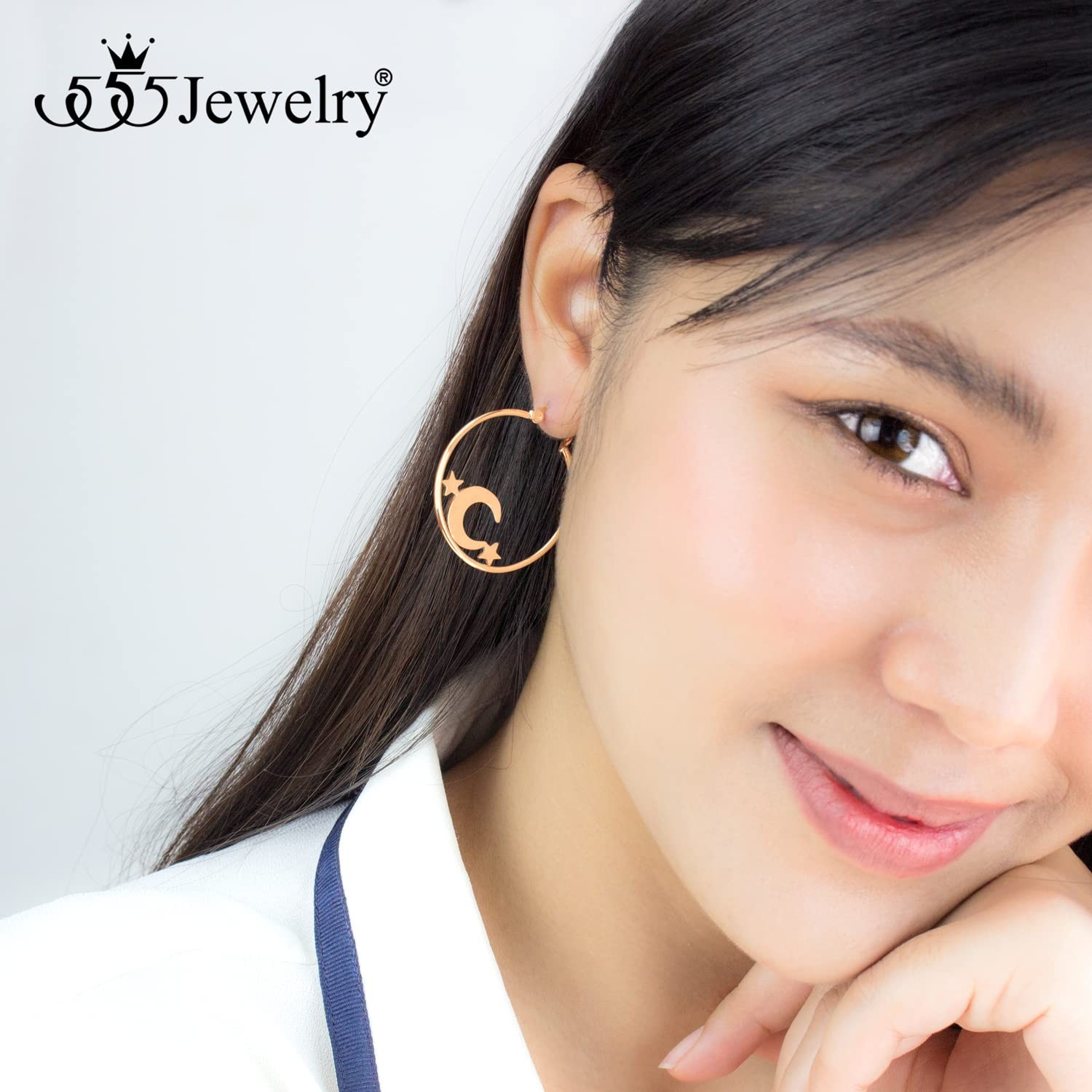 как выглядит 555Jewelry Stainless Steel Celestial Moon Stars Earrings, Rose Gold фото