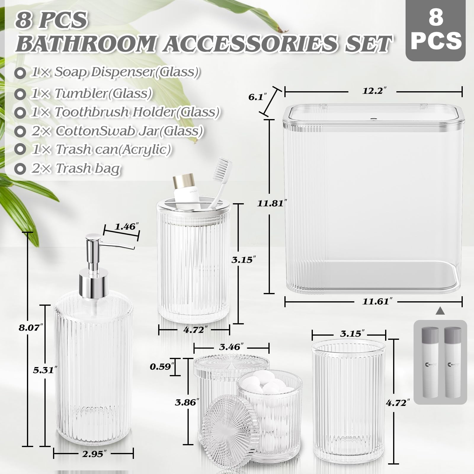 Clear Bathroom Set 8 Pcs, Trash Can with Bags, Glass Bathroom Set Include Soa...
