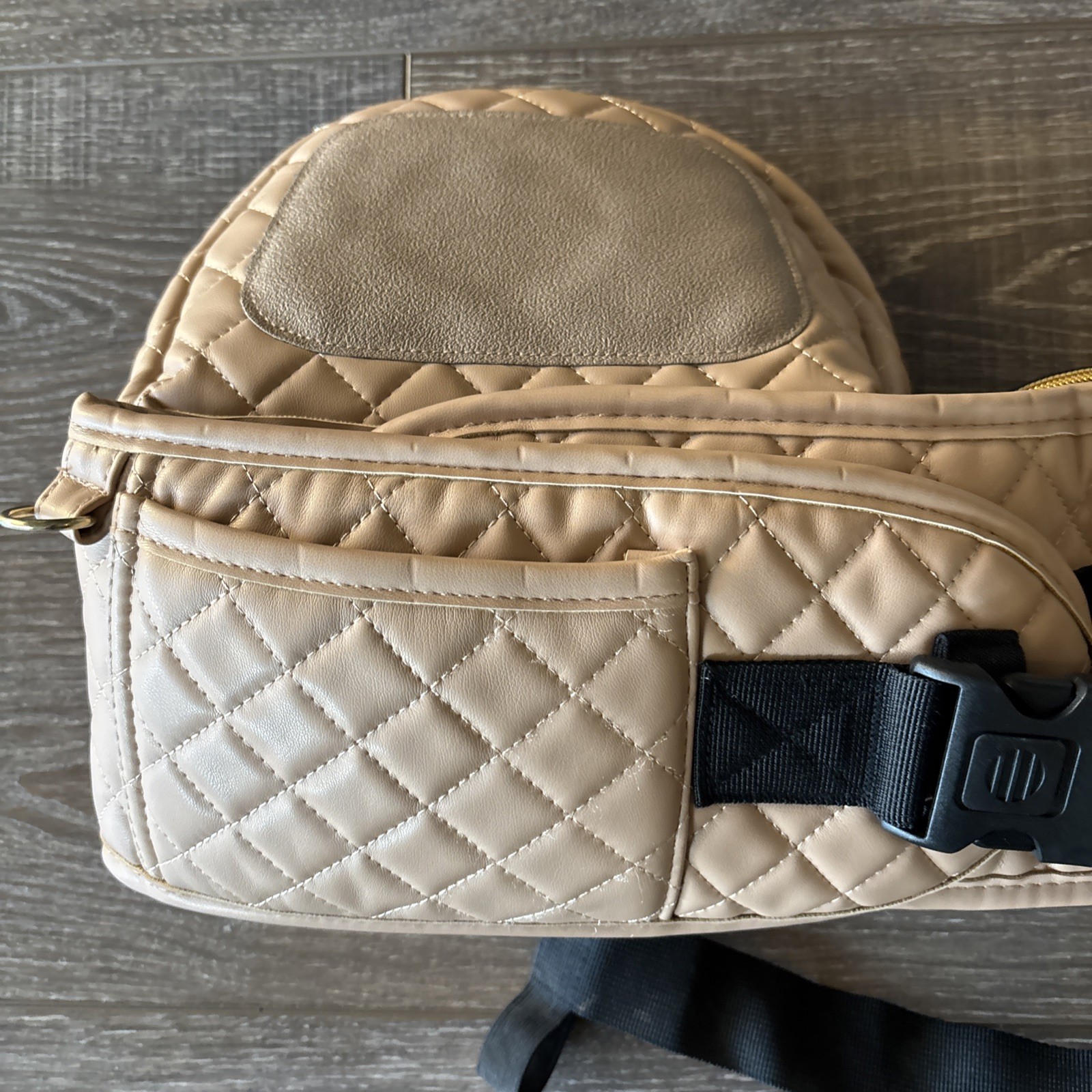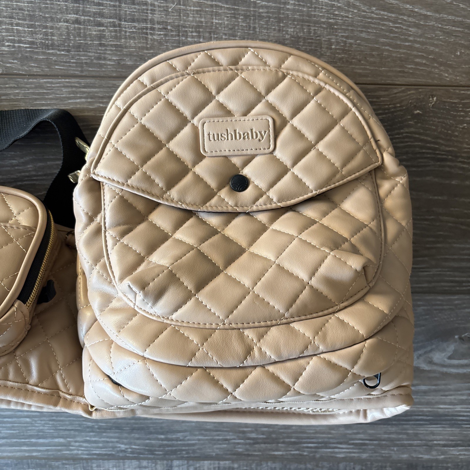 как выглядит Tushbaby Vegan Leather Hip Seat Baby Carrier EUC - Tan Quilted Gold Zippers фото
