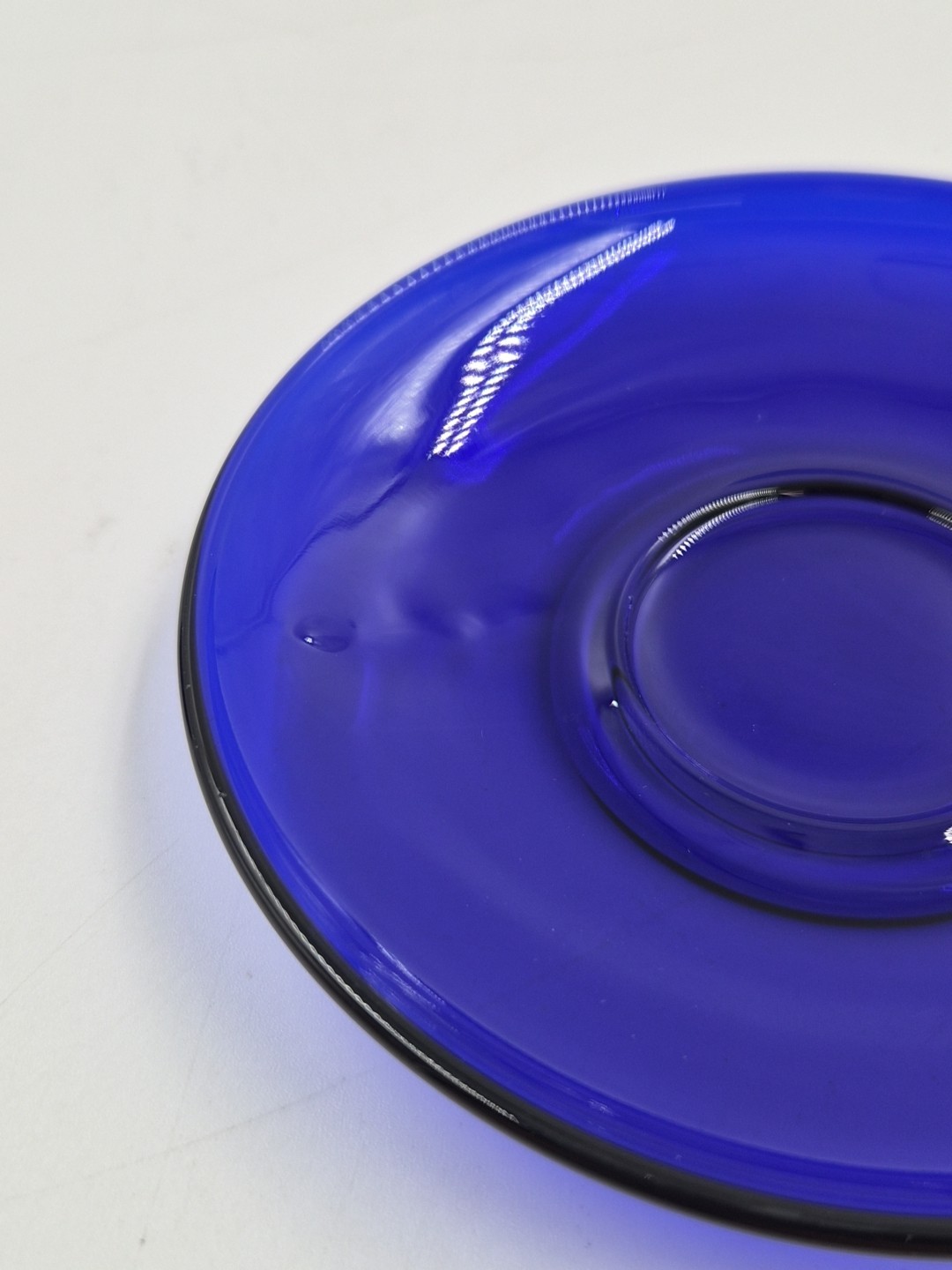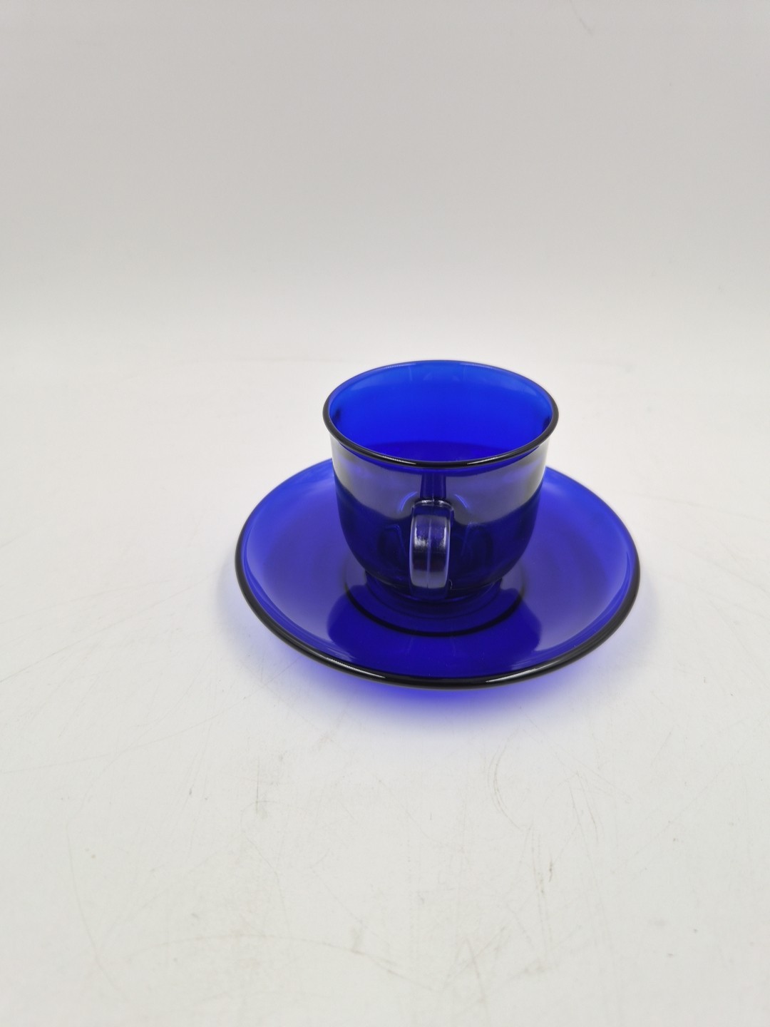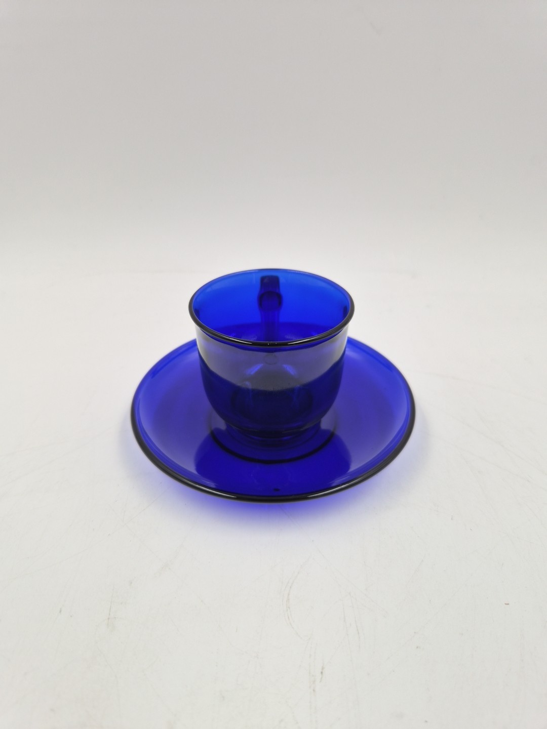 как выглядит Miniature Cobalt Blue Glass Cup Teacup Doll 2" France Small Saucer Handle Used фото