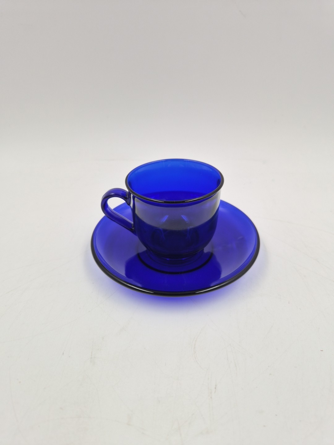 Miniature Cobalt Blue Glass Cup Teacup Doll 2 France Small Saucer Handle Used
