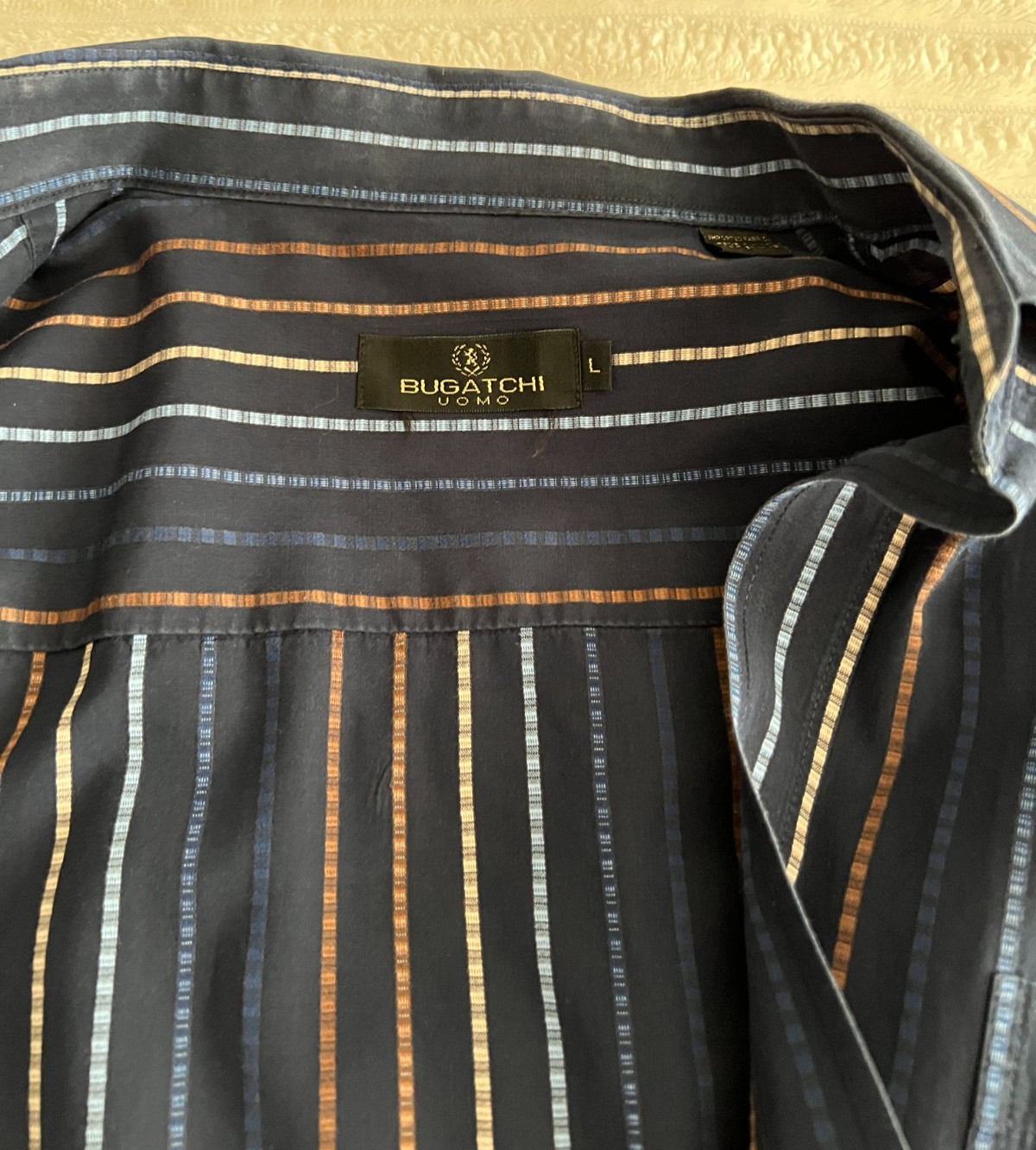 как выглядит BUGATCHI UOMO L/S STRIPED BUTTON DOWN NAVY SHIRT-LARGE-EUC фото