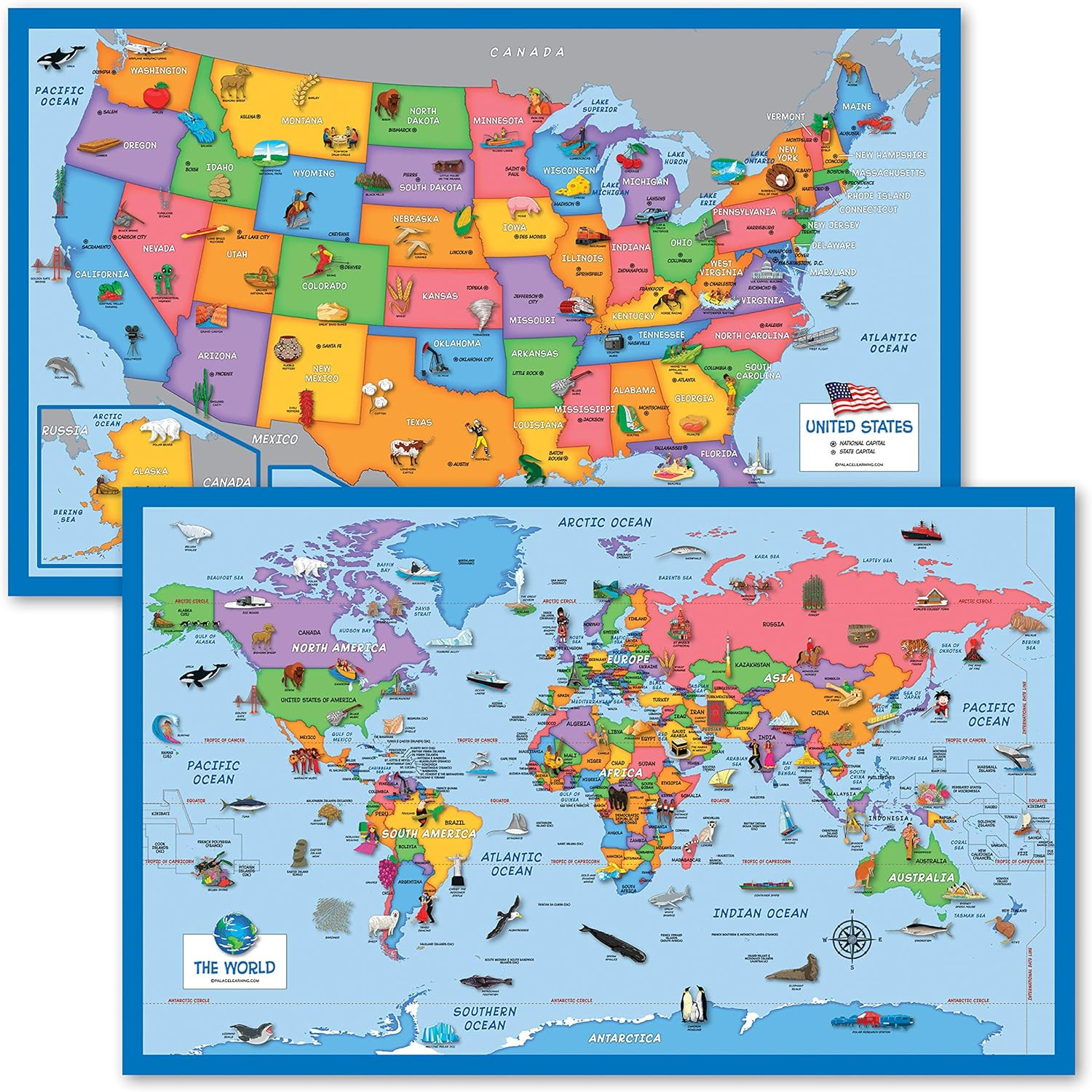 как выглядит 2 Pack - World USA Map for Kids Illustrated - 2 Poster Set LAMINATED, 18" X фото
