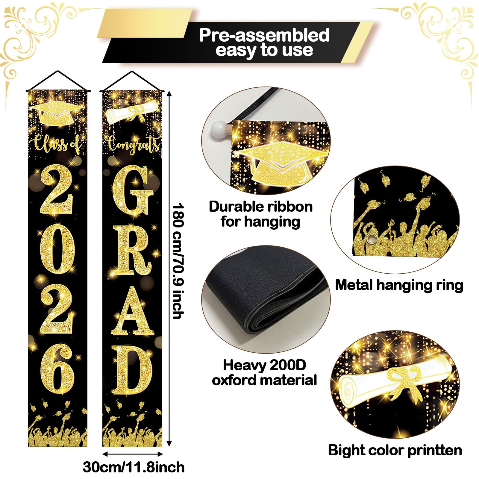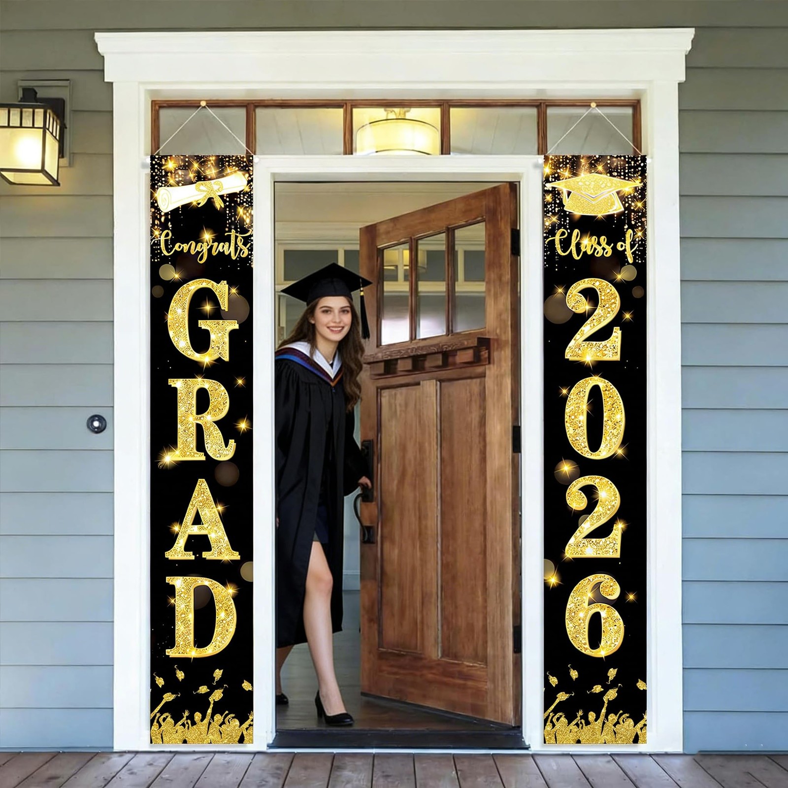 Class of 2026 Graduation Porch Banners Black Gold Congrats Grad Outdoor Sign