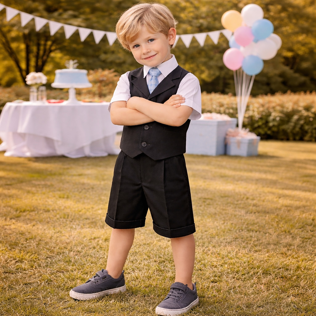 Boys 4-Piece Vest Short Set Formal Wedding Outfit Suit with Shirt, Tie Shorts