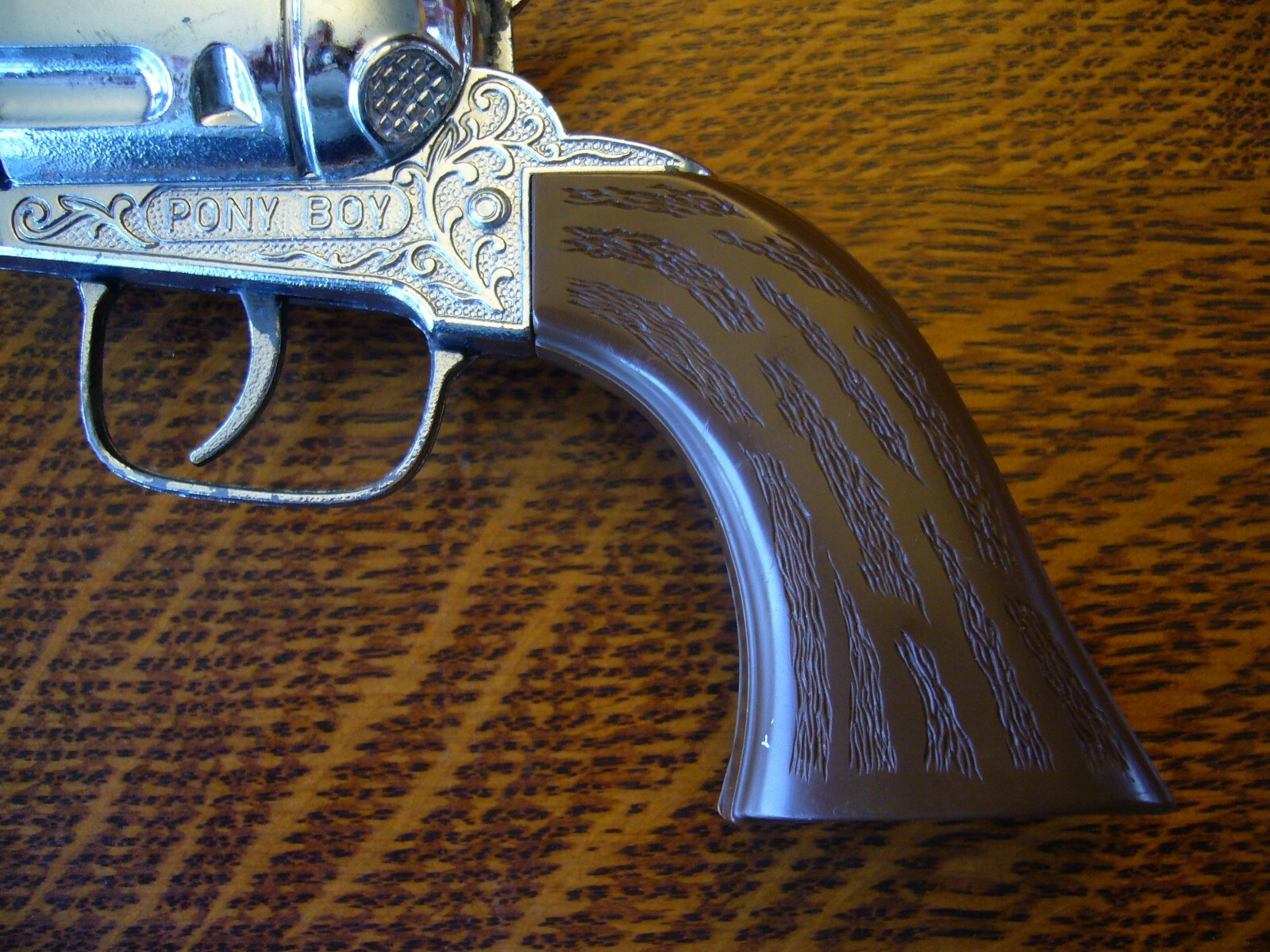 как выглядит VINTAGE PAIR PONY BOY WORKING DIECAST METAL CAP GUNS BROWN PLASTIC GRIPS WORKING фото