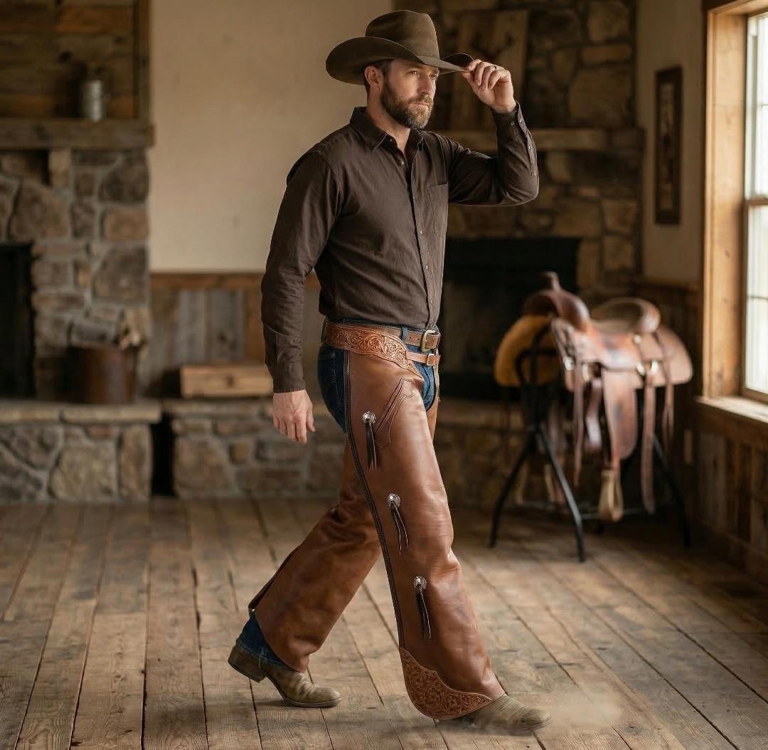 как выглядит Mens Hand Crafted Cowboy Style Suede Leather Pant Rodeo Style Chap Leather Pant фото