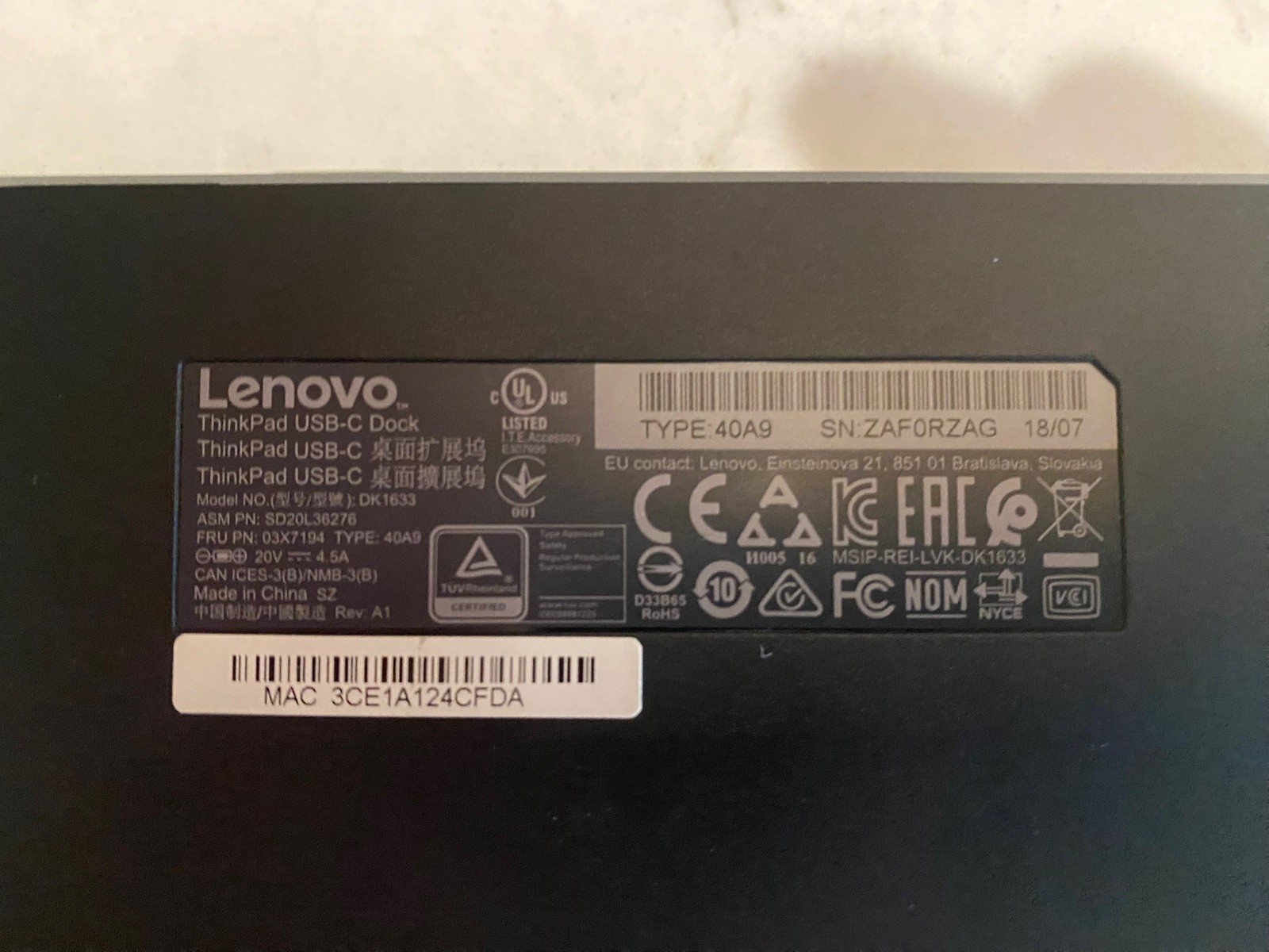 Lenovo DK1633 40A9 ThinkPad USB-C Dock Station 40A9 90W Power Supply