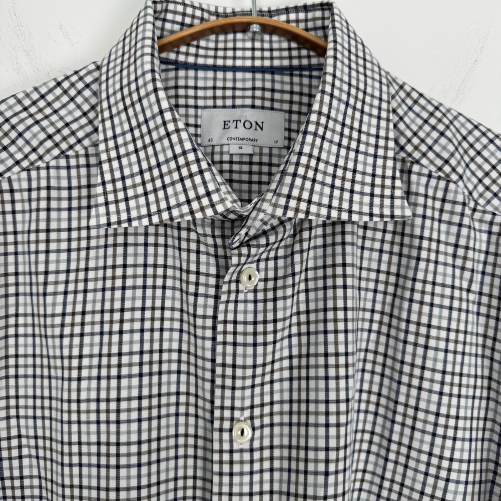 как выглядит Eton Contemporary Fit Dress Shirt Mens XL 17 Check Plaid Long Sleeve Navy Brown фото