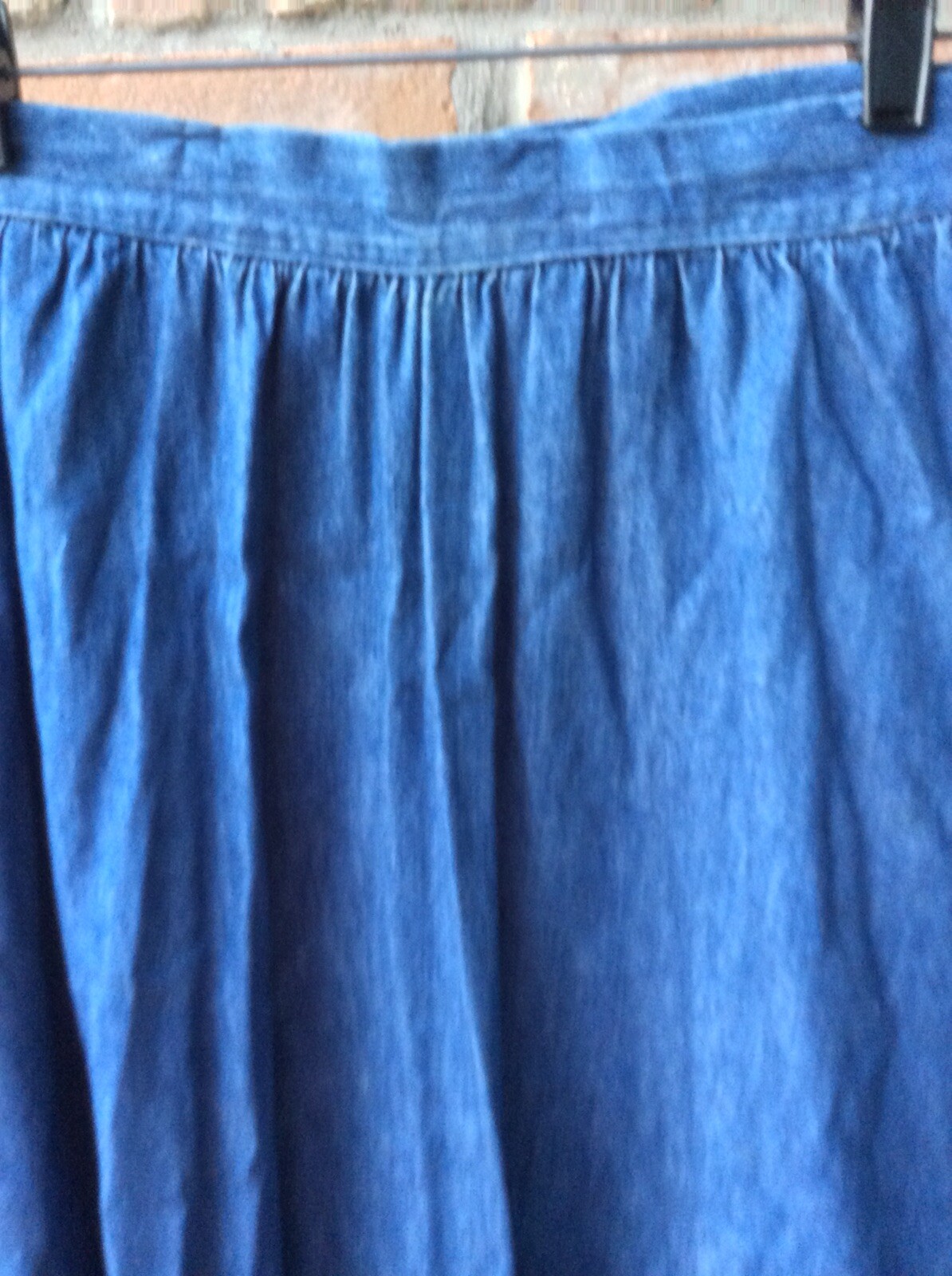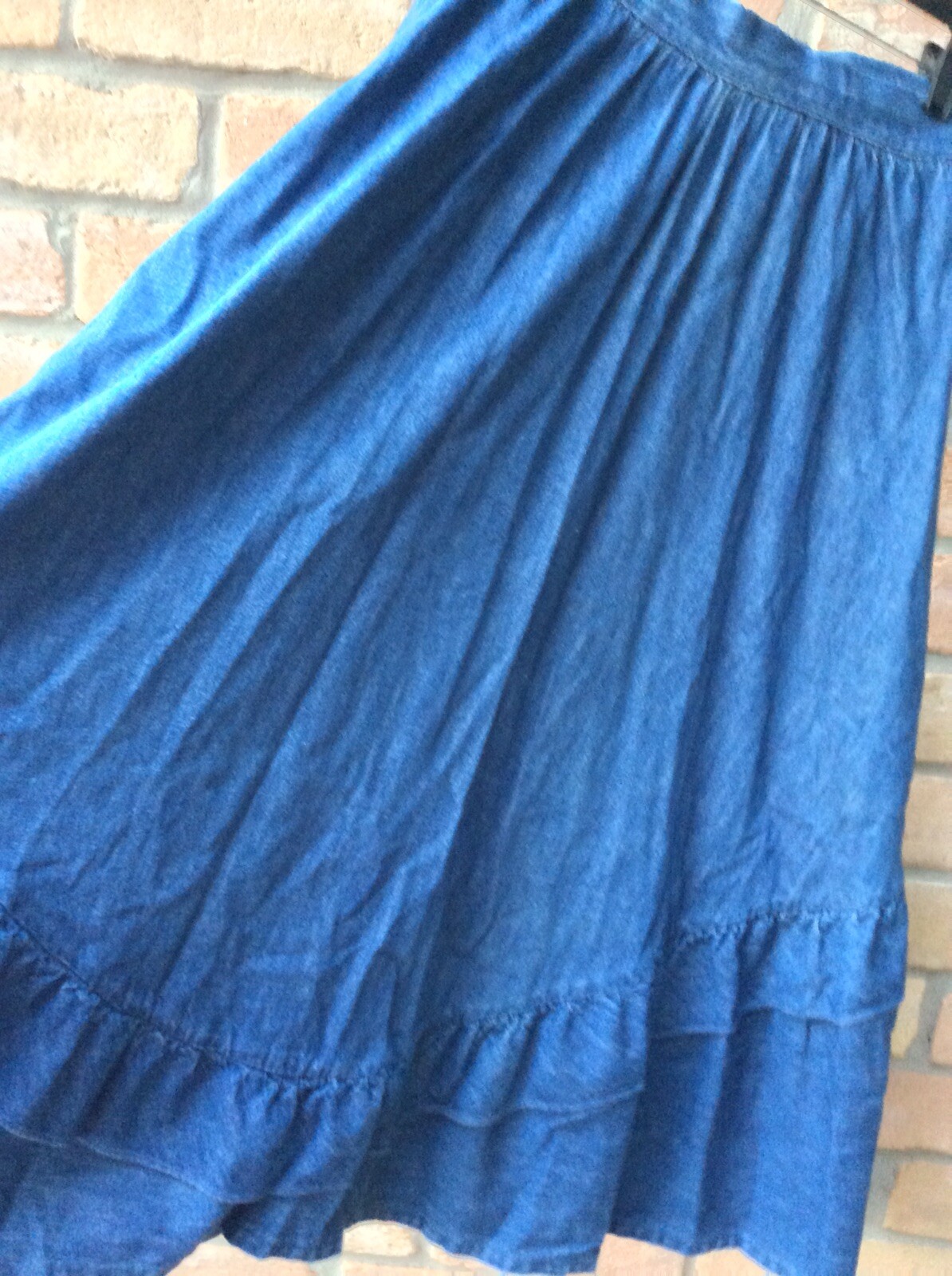 как выглядит VTG 80s Blue Denim Prairie Skirt Sz S 26"W Ruffle Country Western Rustic Farm фото