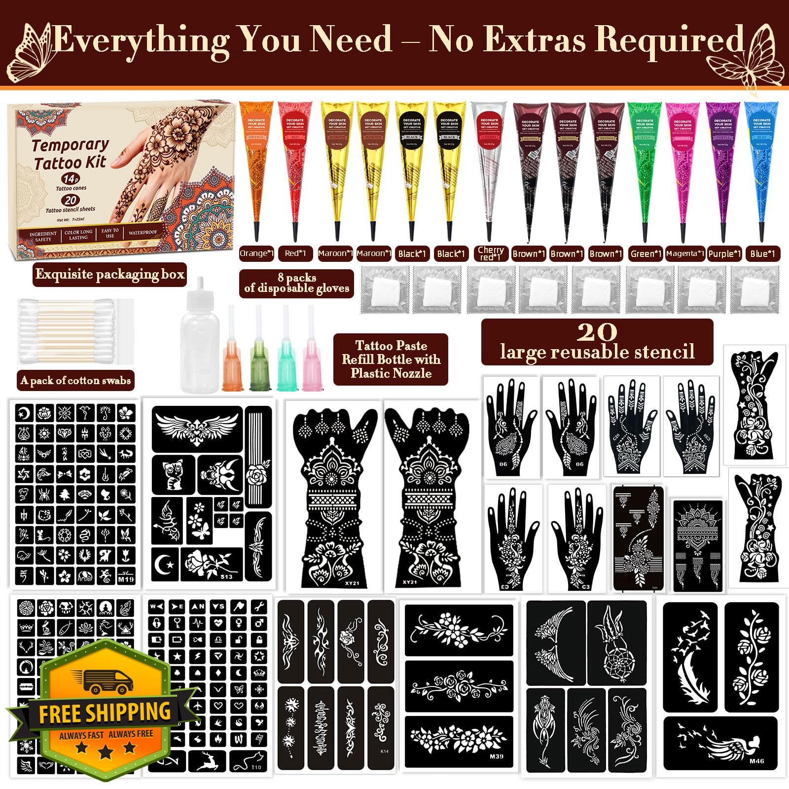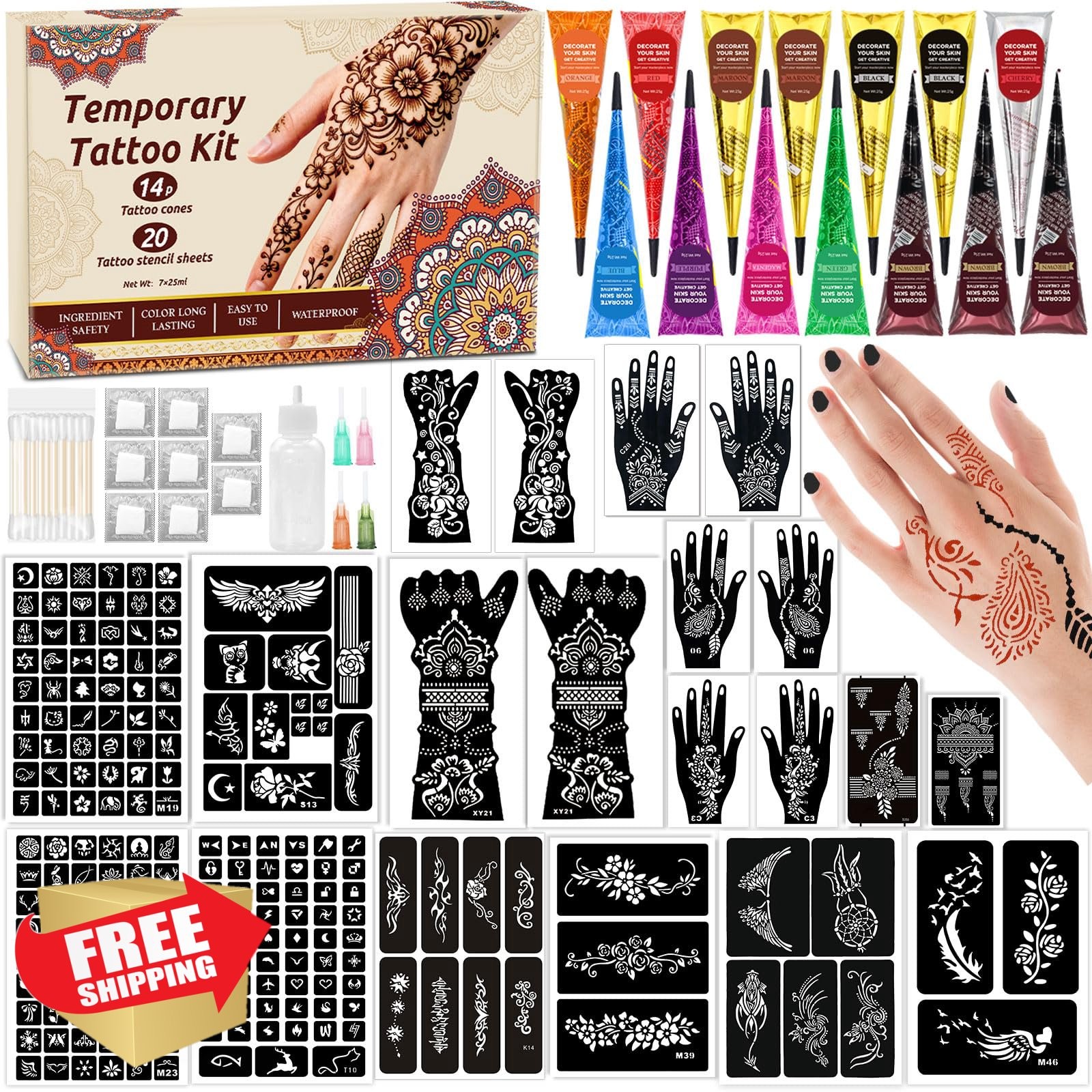 Temporary Tattoo Kit 20 Stencils 14 Cones 10 Colors Skin Art Set DIY