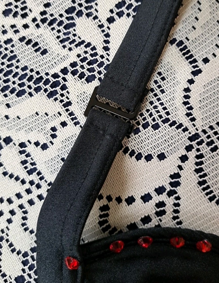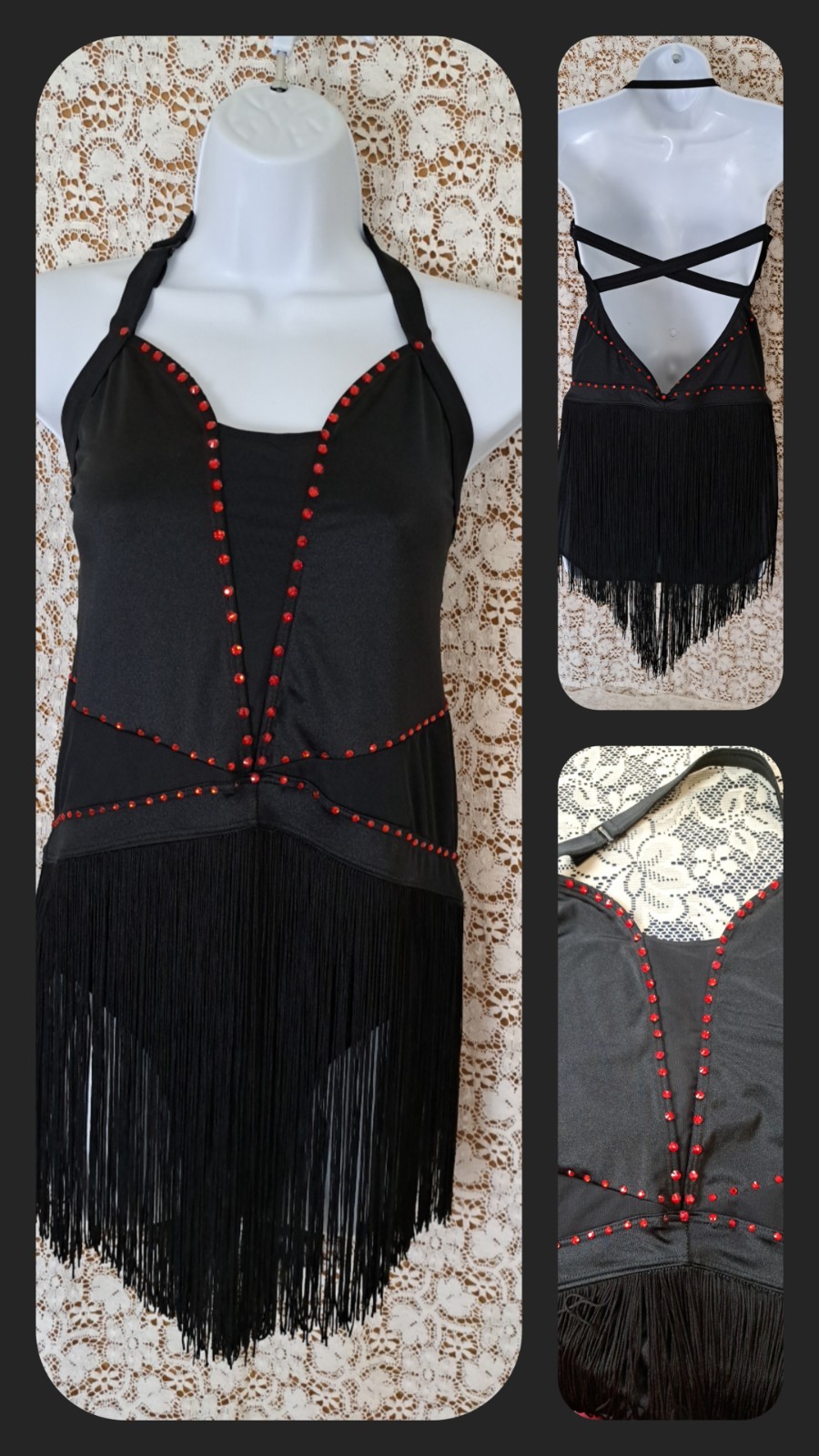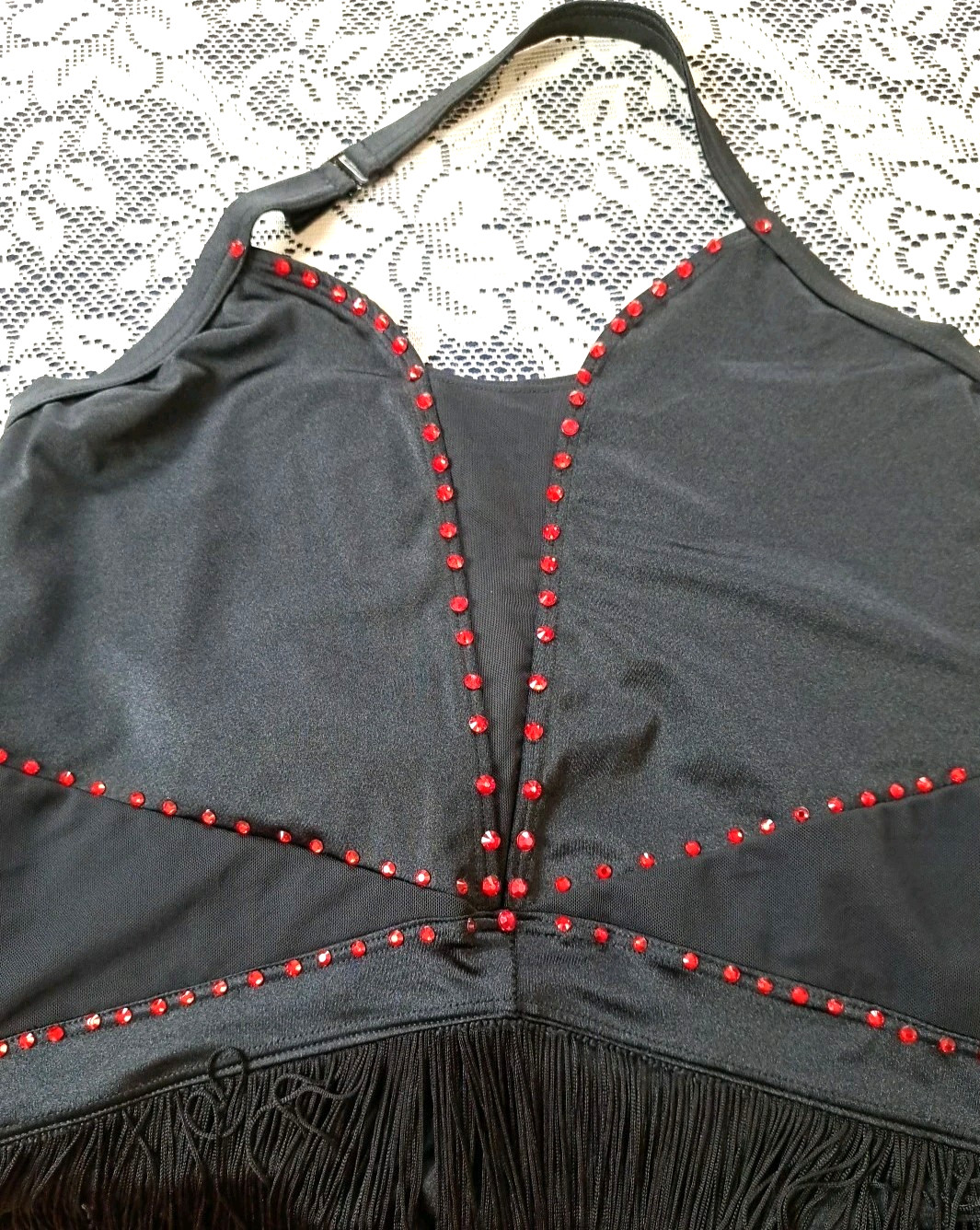 как выглядит Balera Dance Costume XL Black Red Rhinestone Fringe Halter Bodysuit Strappy Back фото