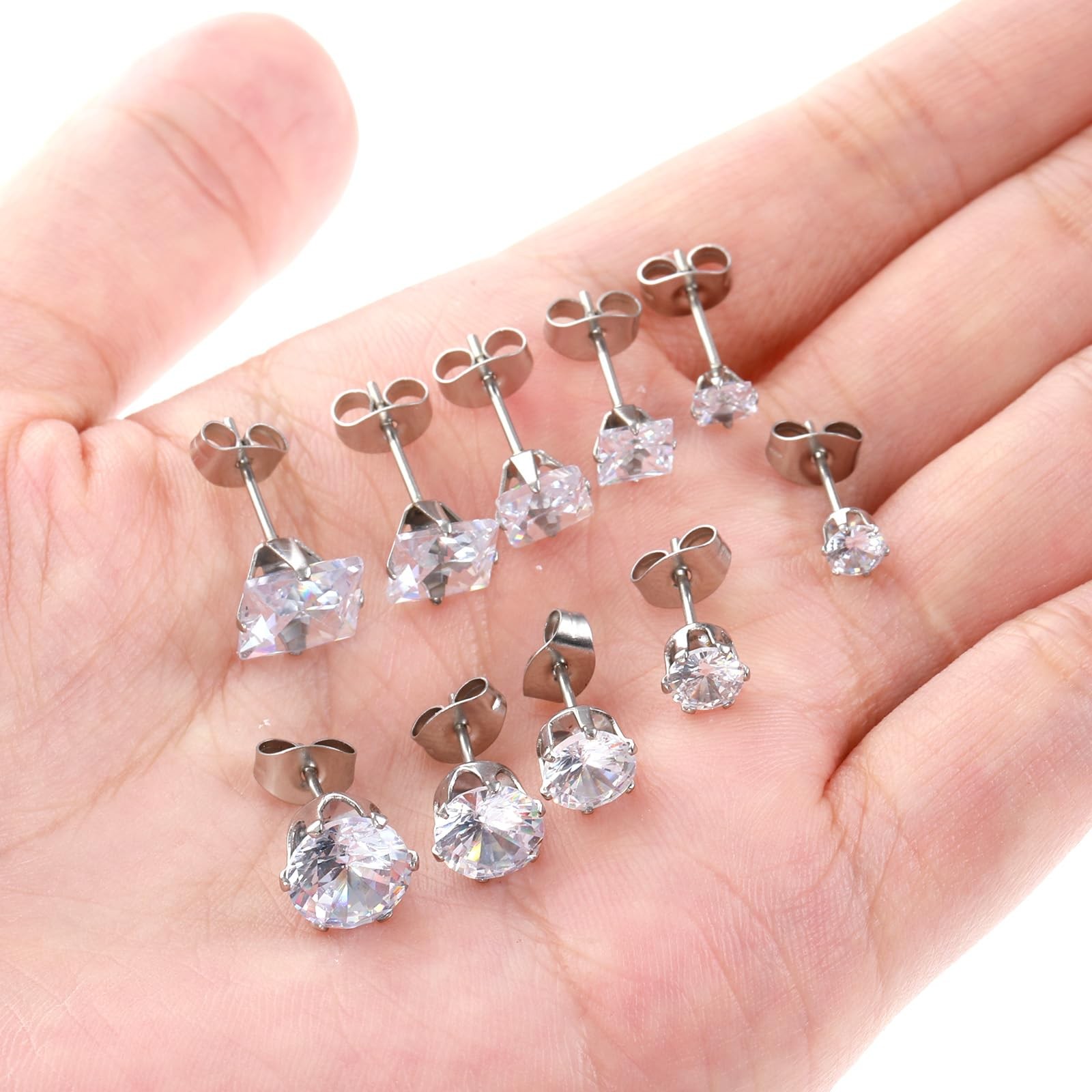 10 Pairs CZ Stud Earrings for Women, Small Stainless Steel Medium, Silver