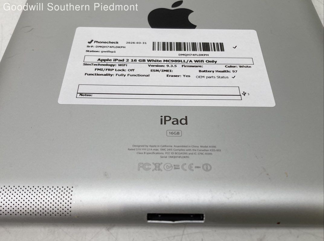 Apple iPad 2 MC989LL/A 16GB White Silver Wi-Fi Tablet - Tested