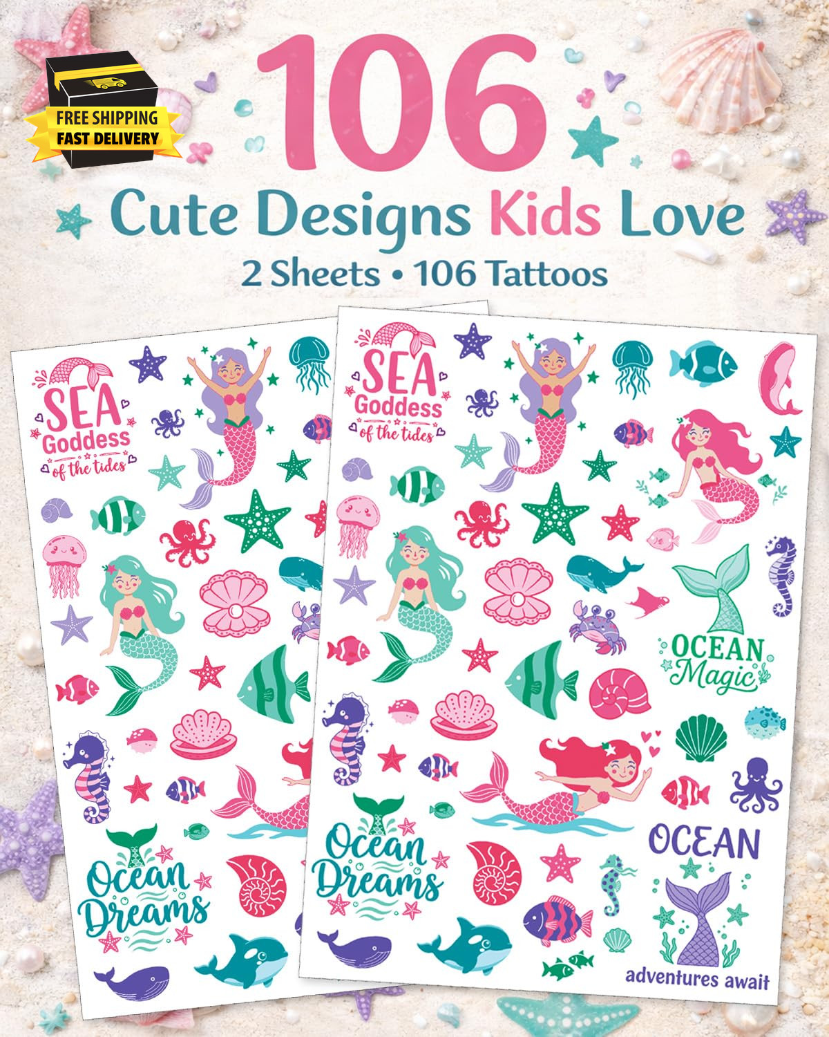 Mermaid Temporary Tattoos for Kids 106 Cute Ocean Mermaid Designs, Waterproo