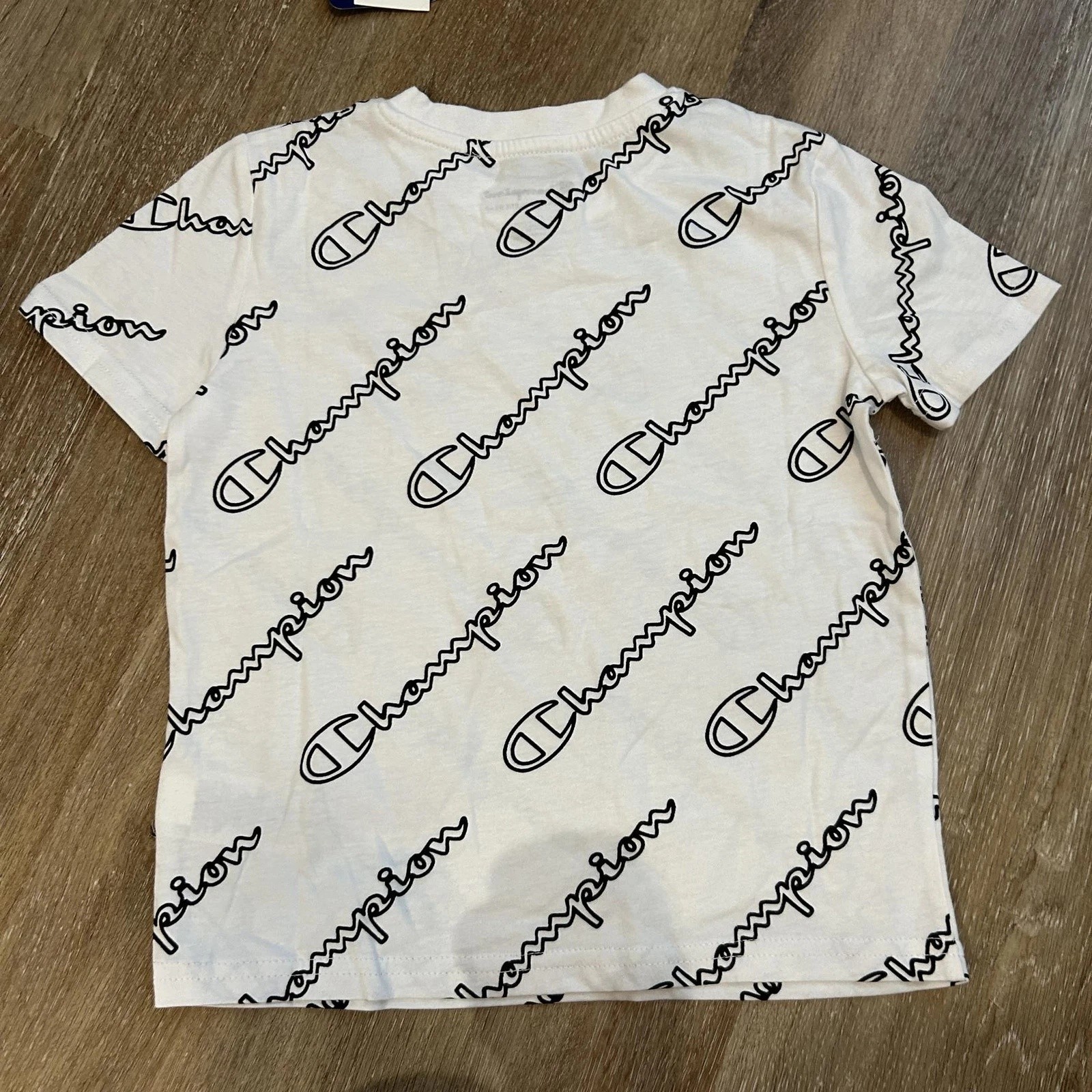 как выглядит Champion Shirt Youth 5, White Allover Script Logo Graphic Tee Short Sleeve фото