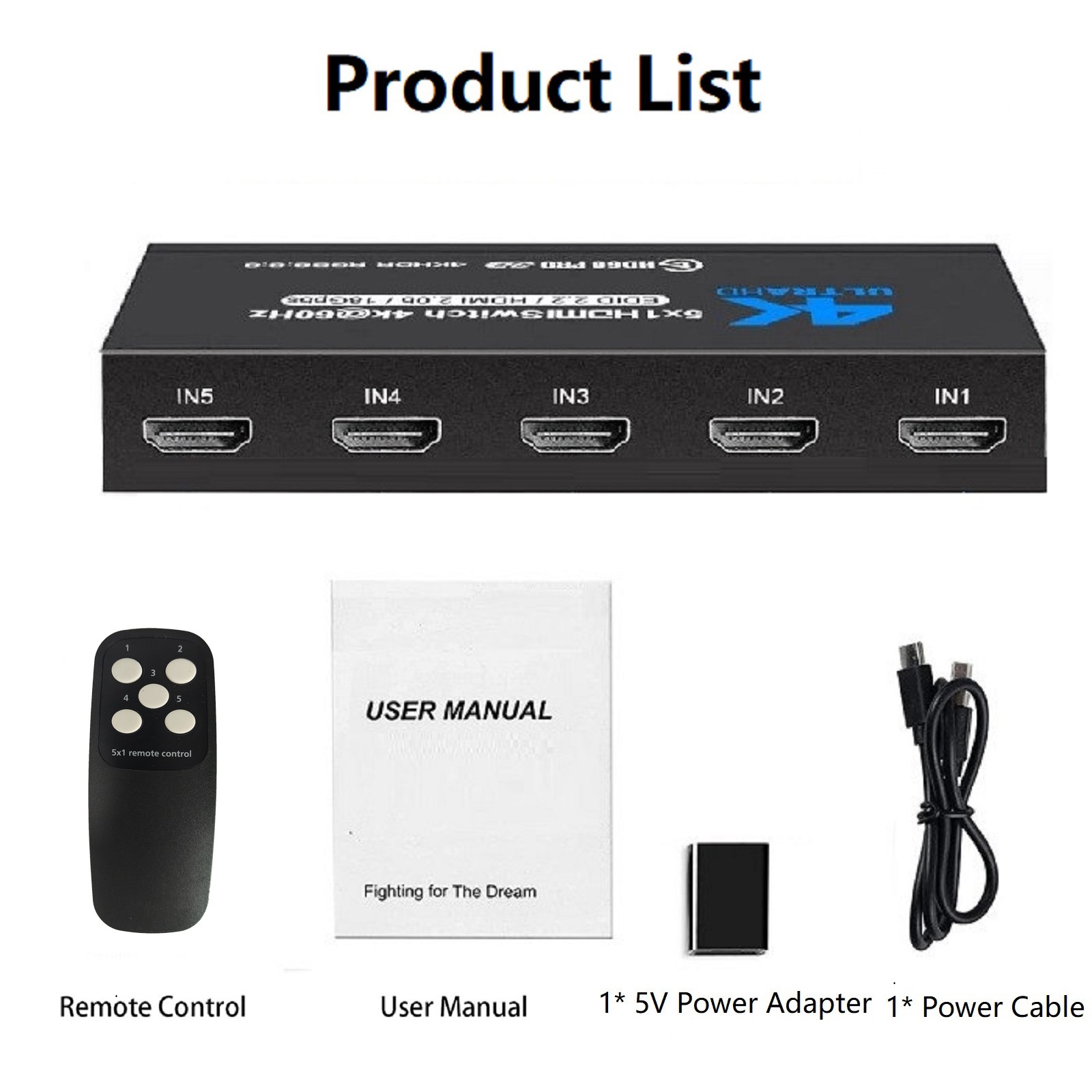 5 in 1 Out 4K 60Hz 5x1 HDMI Switcher HDMI 2.0 Switch with IR Remote Control