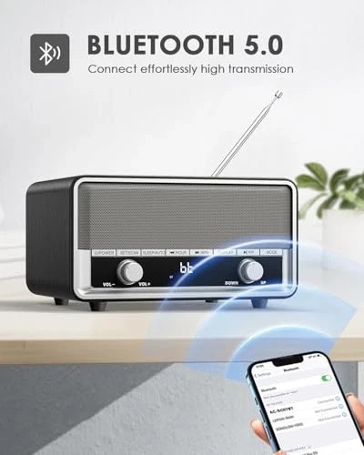 Vintage Wood AM FM Bluetooth Radio with Clock, Digital Clock Radio for Bedroom