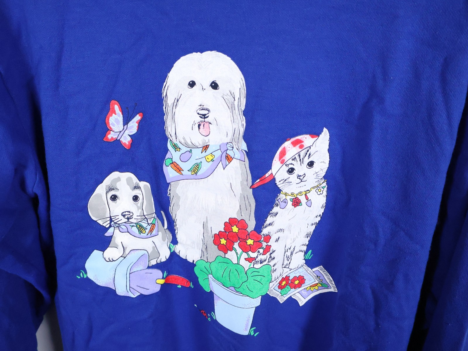 80s Dogs Cats Flower Sweatshirt Women's Large Blue Collared Acrylic Grandma VTG