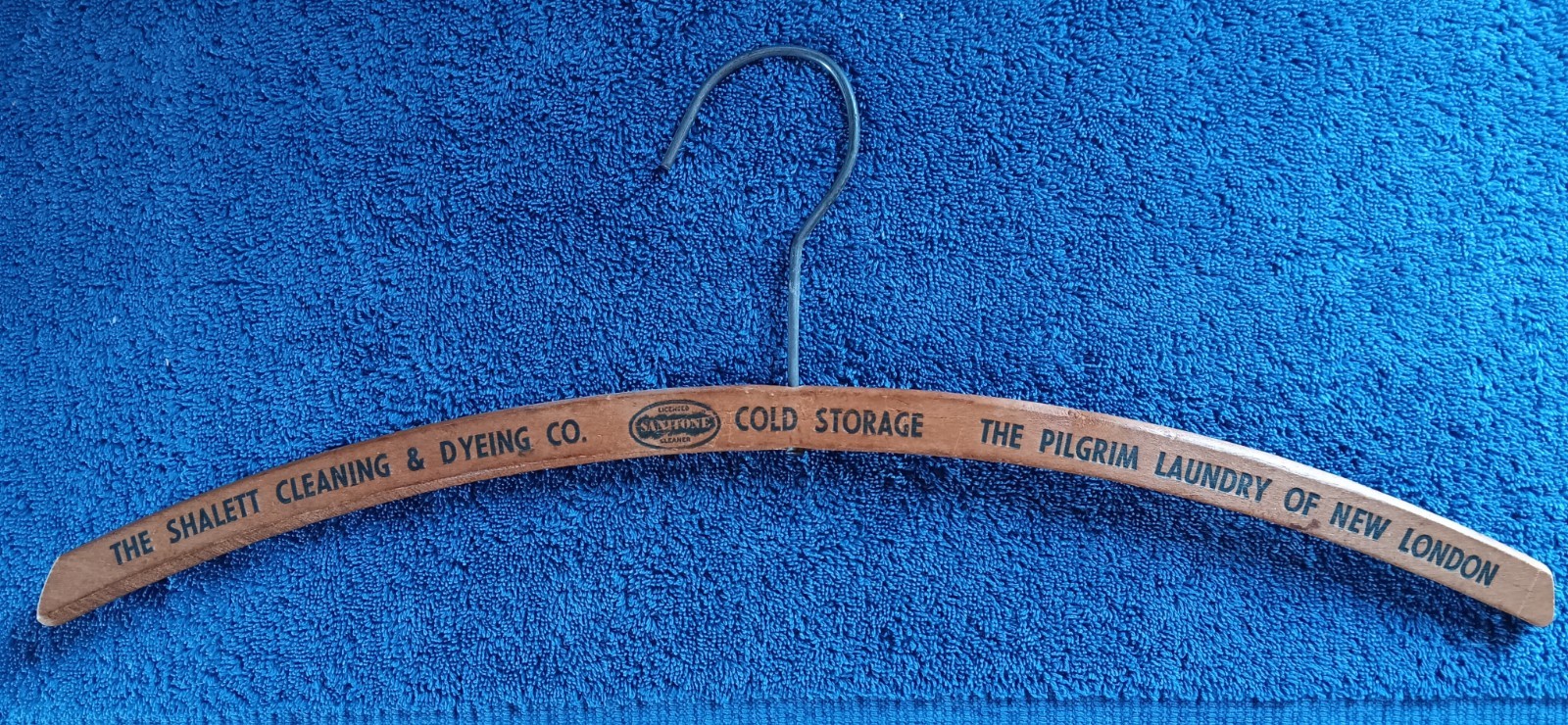 Vtg Wooden Coat Hanger New London Ct Shallet Cleaning Dyeing Cold Stor. Pilgrim